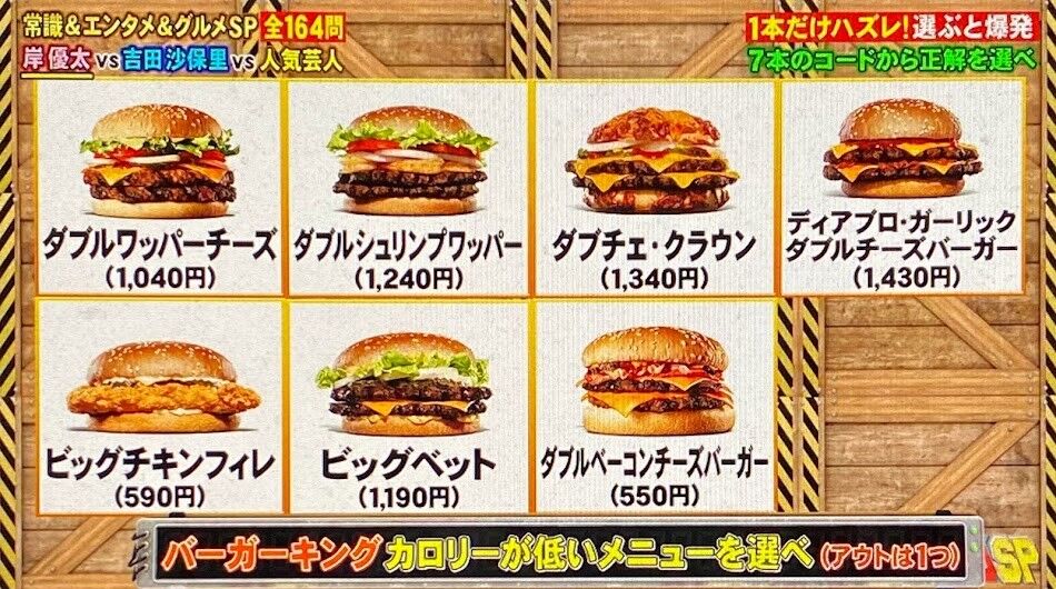 1,次のバーガーキングのバーガーで一番カロリーが高いものを当ててください