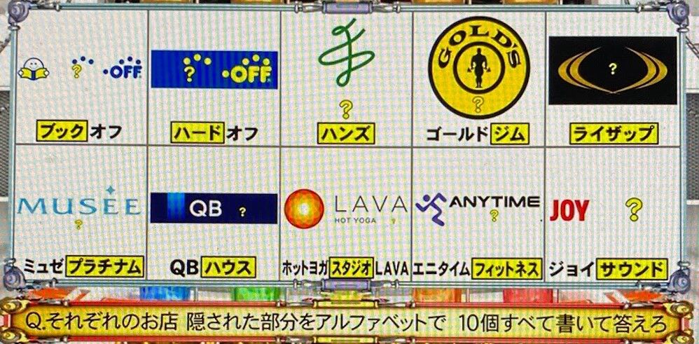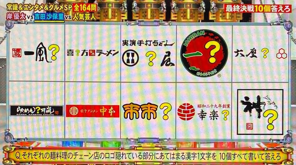 5,それぞれの麺料理チェーン店のロゴ 隠れている部分に当てはまる漢字1文字を10個すべて答えろ