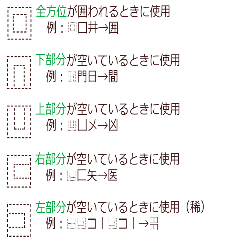 次に紹介するのは囲い系の記号です。⿴⿵⿶⿷の5つがあり、以下のように使い分けられます。