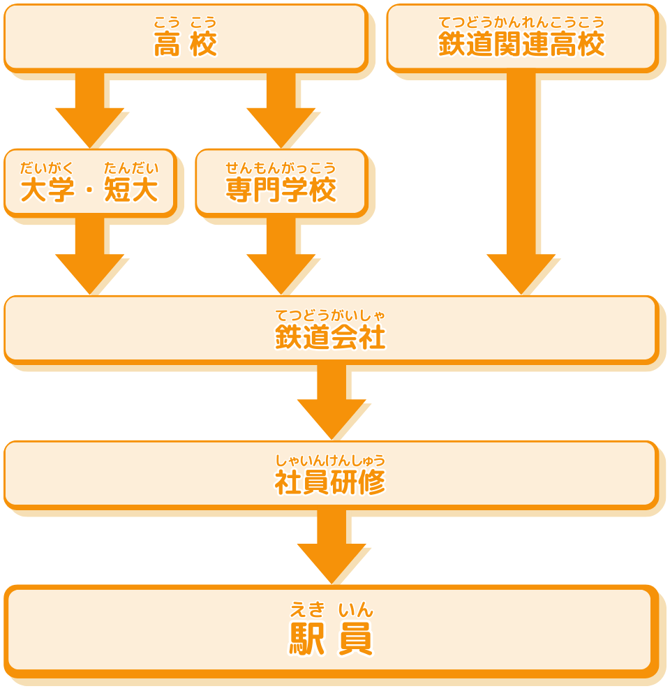 駅員の仕事につくための主なルートが一目で分かるチャートだよ!