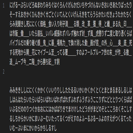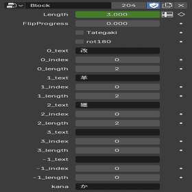 ブロックの上面と側面の文字のシーケンスはテキストデータとして作成します。特殊文字 "_" はその文字を引き延ばす処理を行うためのもので、読み仮名と組み合わせたときに便利に扱うことができます。過置換でも同じ手法を使いました。