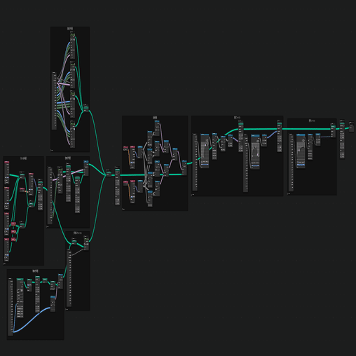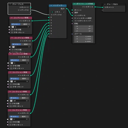 ジオメトリノードでの実装部分はそこそこの量がありますが、ブロックの挙動を見た目通りに手続き的に作っているだけなので割愛します。
