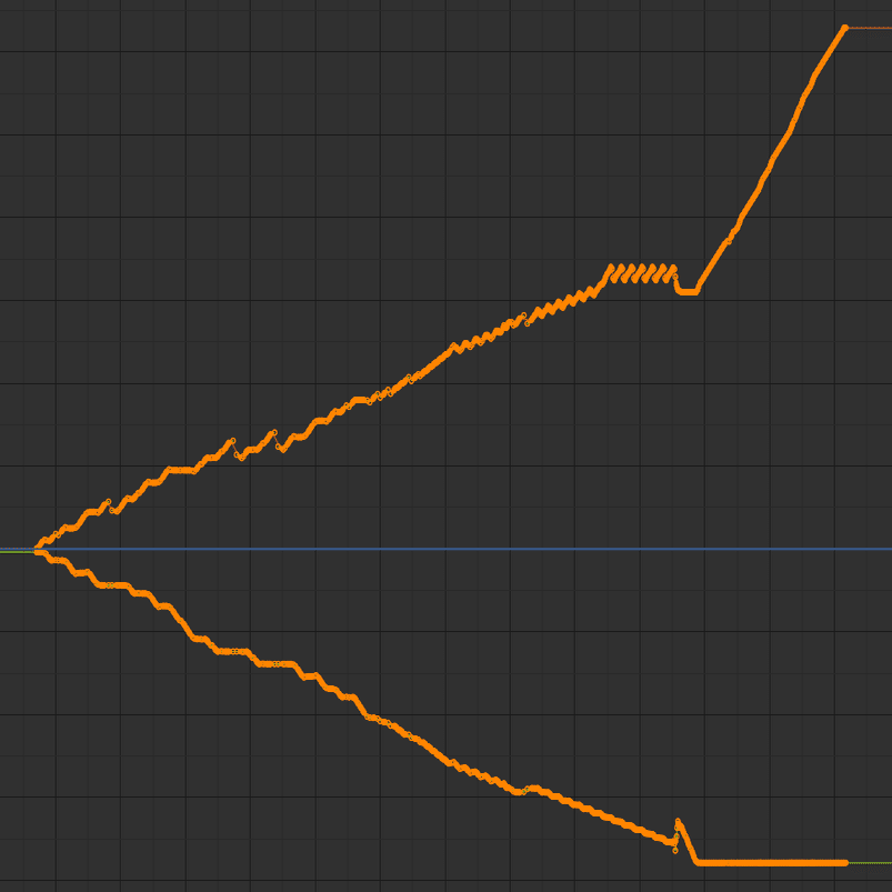 AfterEffectsではエクスプレッションでブロックの座標一覧をカーブに補完するアルゴリズムを実装しカメラの動きを生成しています。Blenderではもっとシンプルにブロックの座標と時間をカメラの位置プロパティにキーフレームとして展開し、Blenderのグラフエディタ標準機能で滑らかにしてます。