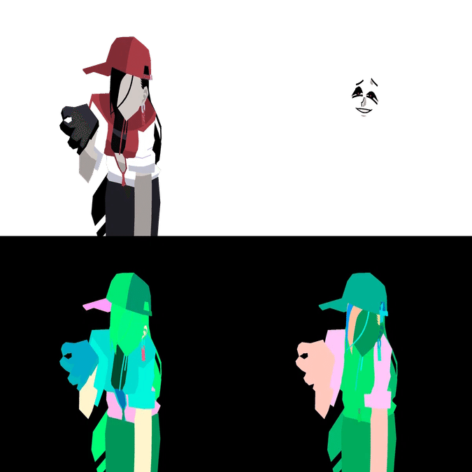 顔の影は先のマテリアルマスクで肌色を抜き、AfterEffects上のシェイプレイヤーで描画・合成しています。後者はBlender上のシェーダーで作れば良かったです。
