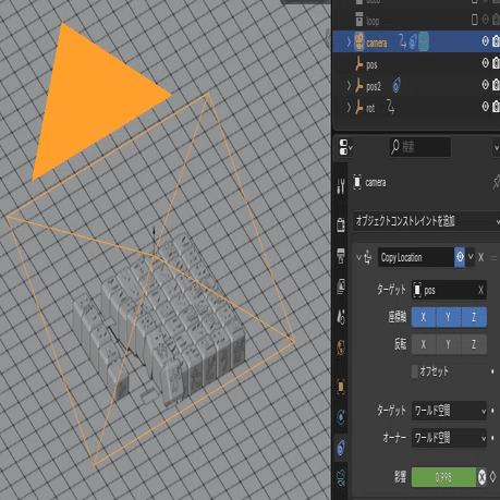 ですから、今回はオブジェクトコンストレイントの「位置コピー」を使用しました。これはオブジェクトの位置を任意のオブジェクトの位置と同期させる機能で、その影響度を0から1でキーフレーム制御できます。ですから、元のキーフレームを弄ることがなく動きを追加ができて、そのうえ元の動きとの継ぎ目をブレンドするのも容易。とても便利!