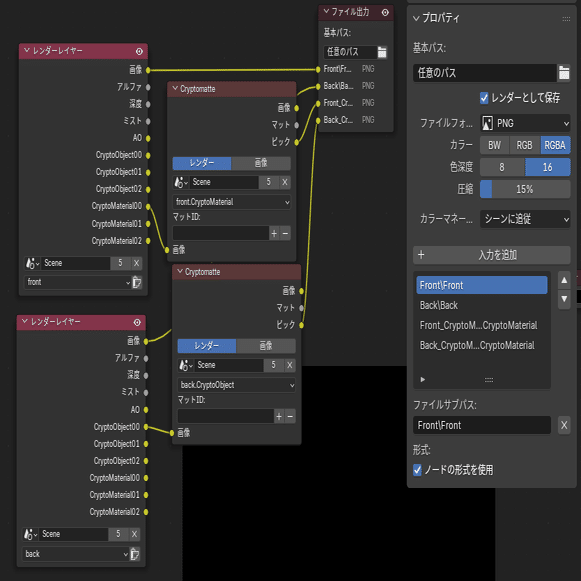 コンポジションノードではレンダリングに関する細かな設定を行えます。今回は複数ビューレイヤーとクリプトマットの同時書き出しに使用しました(Cryptomatteに関しては後述)。また、サブパス名に\ (バックスラッシュ)を記述することで連番をそれぞれフォルダに格納できます。