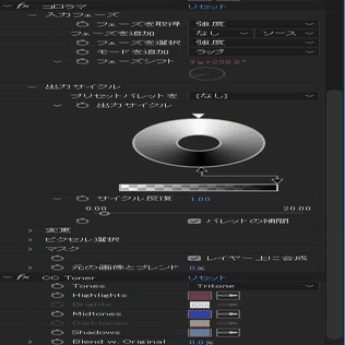 面ごとに異なるマテリアルを割り当てて色分けした後、AfterEffects上でその色を取得、「コロラマ」と「CC Toner」を用いて時間経過に応じてそれぞれの面の色が変化するようにしています。