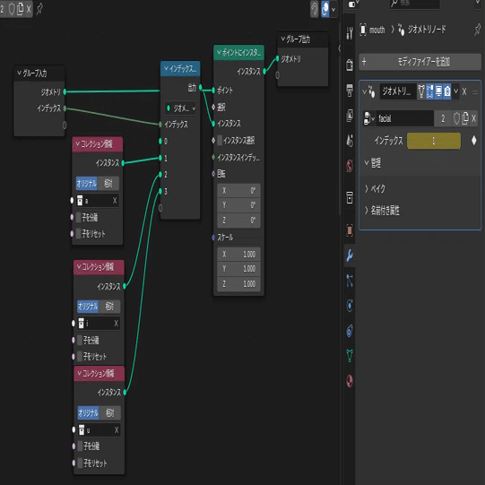 口の切り替えにはジオメトリノードを用いました。