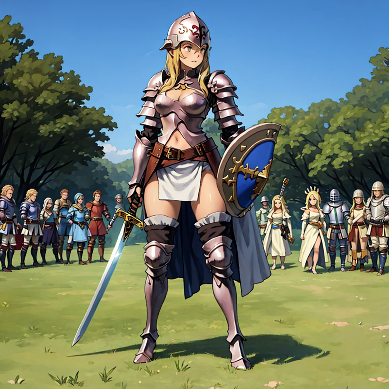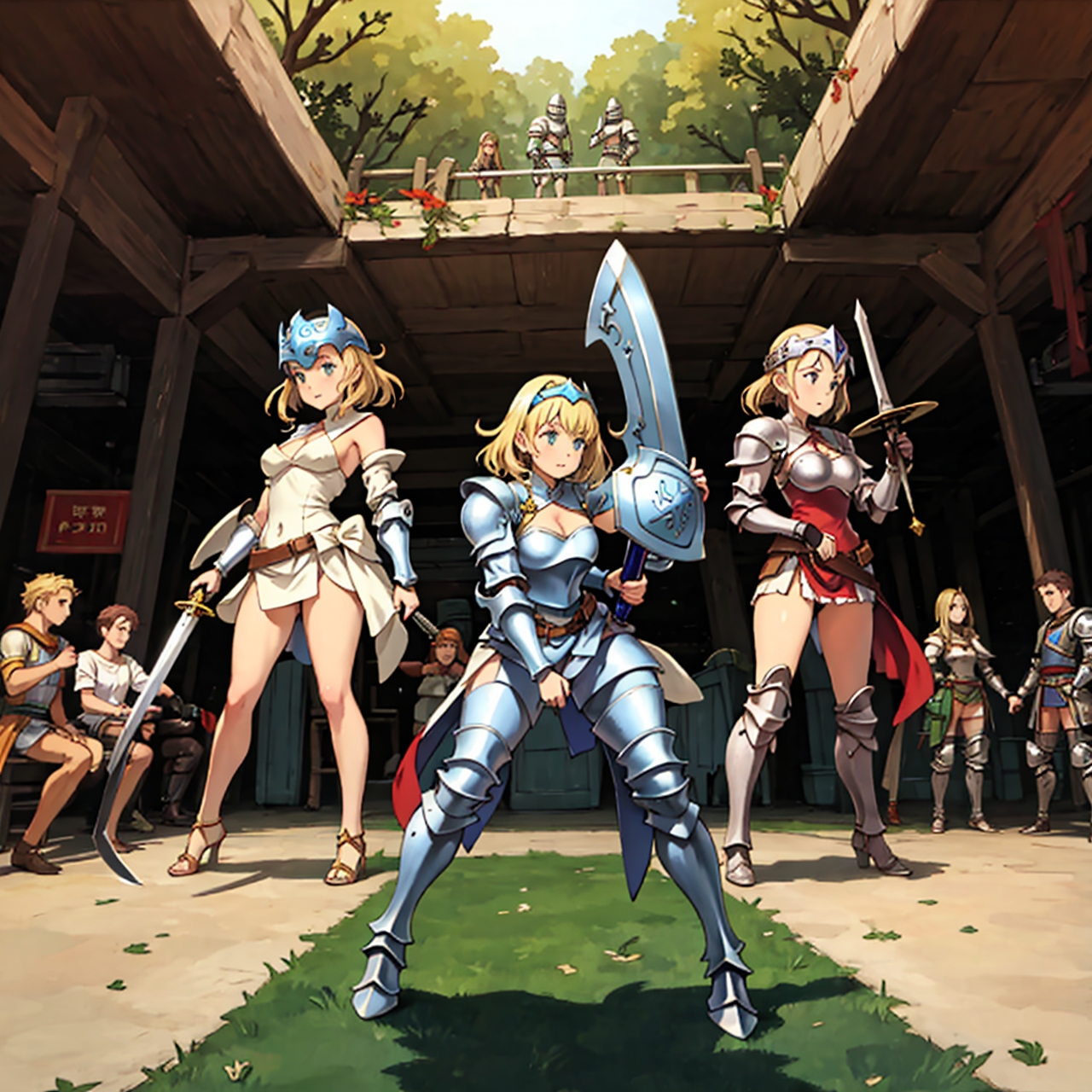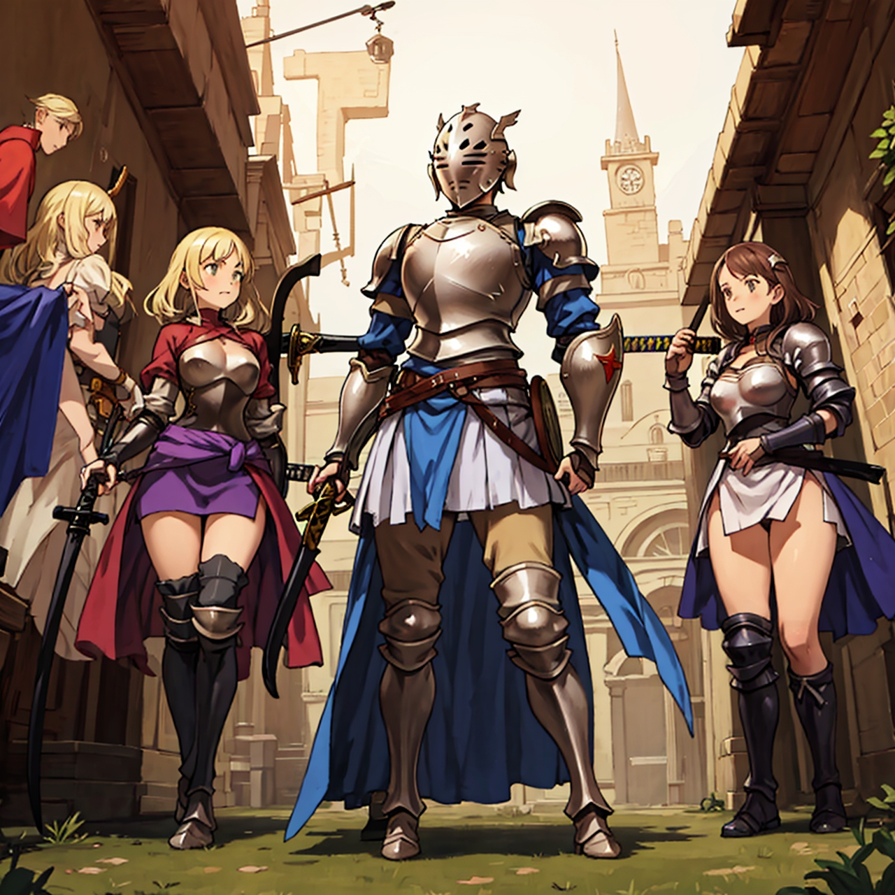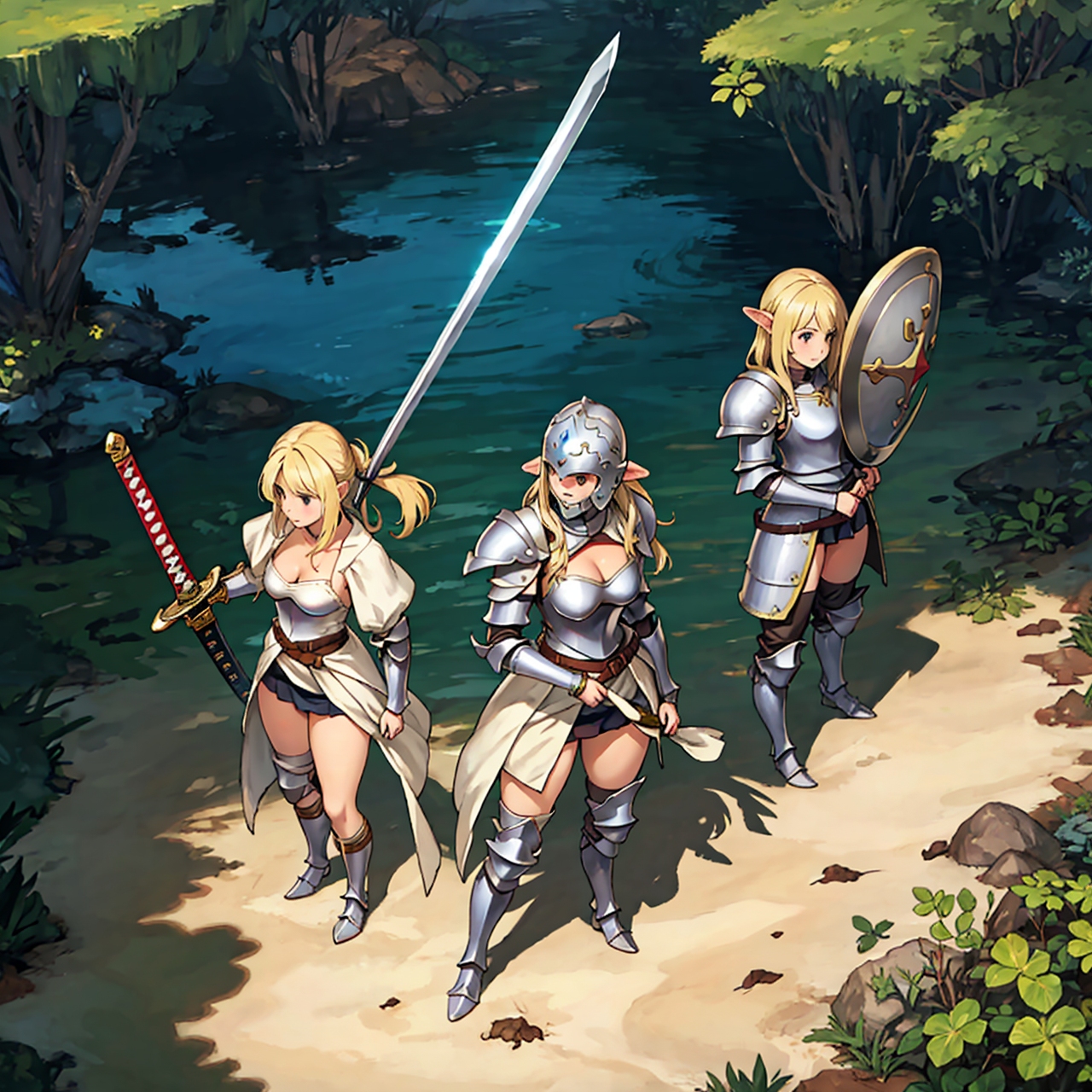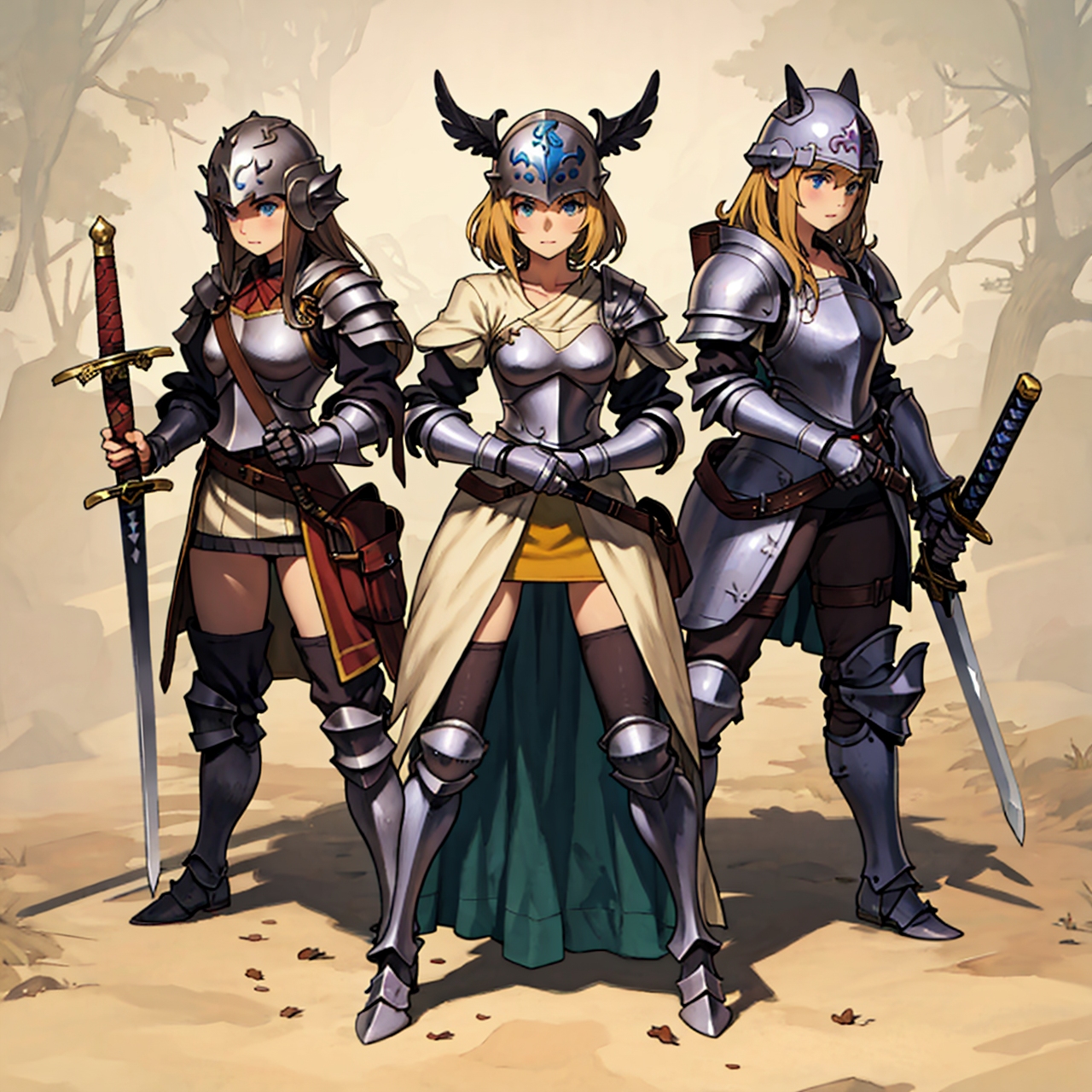 - party of standing girls d & d characters sword shield armor