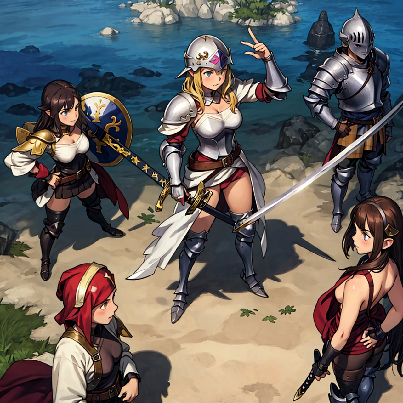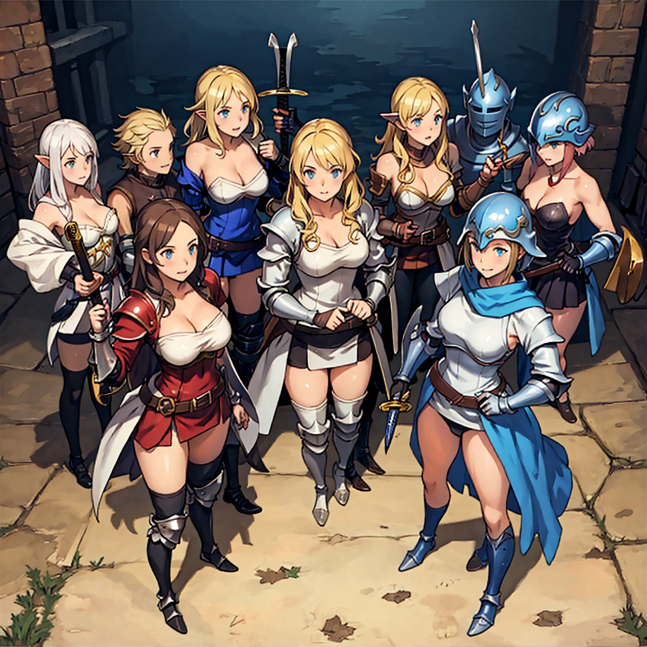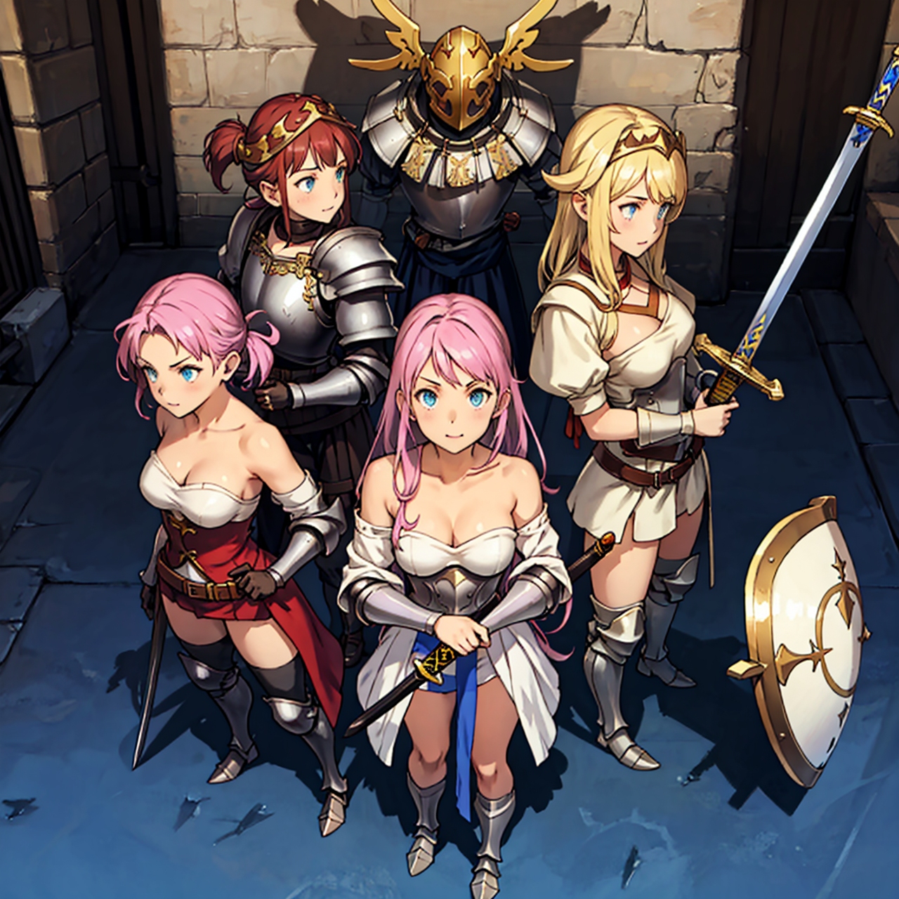 - shot from above party of standing girls d & d characters sword shield armor stuff helmet