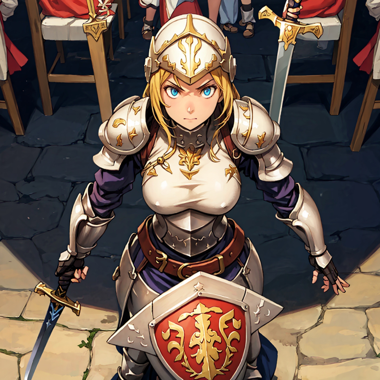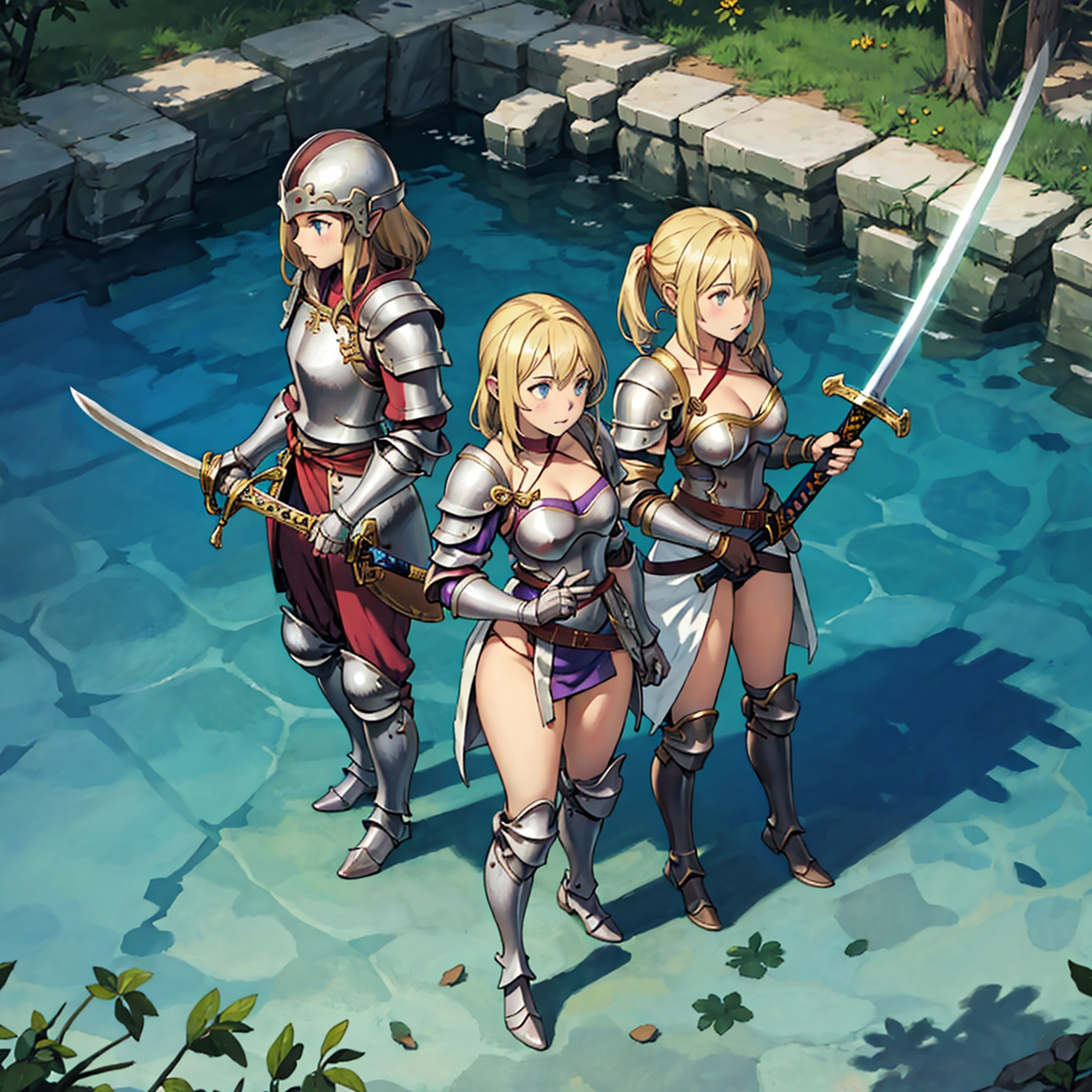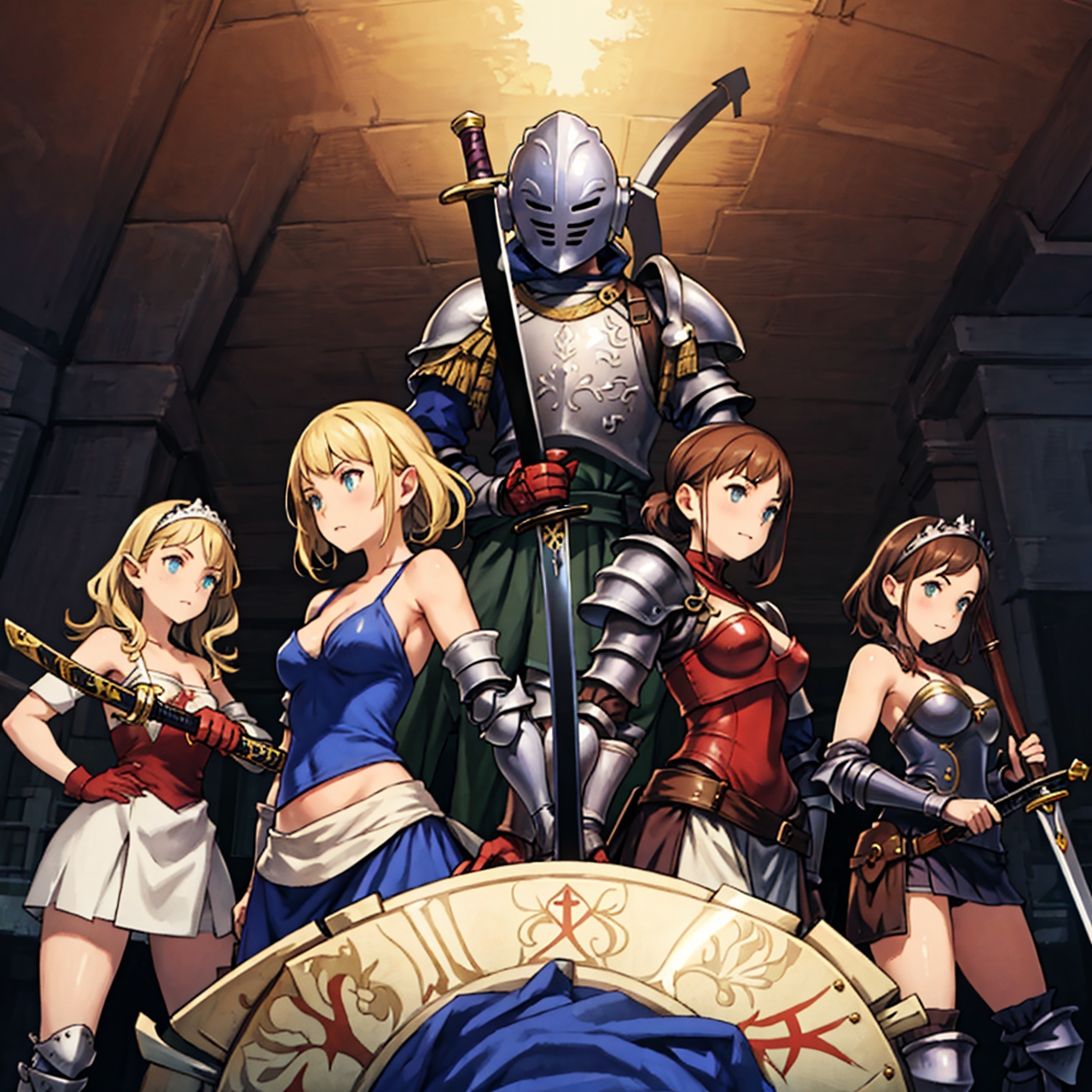 - shot from above party of standing girls d & d characters sword shield armor stuff helmet