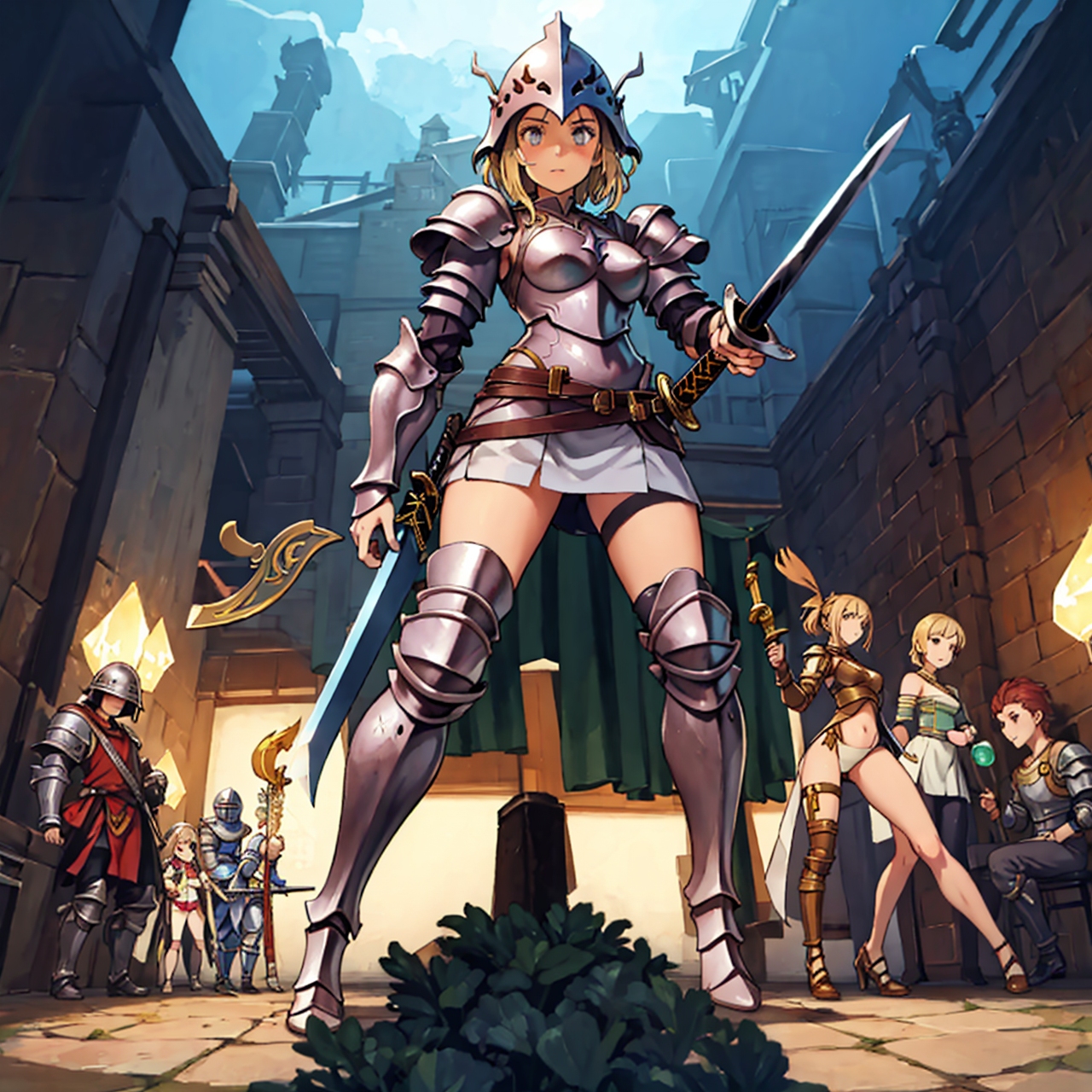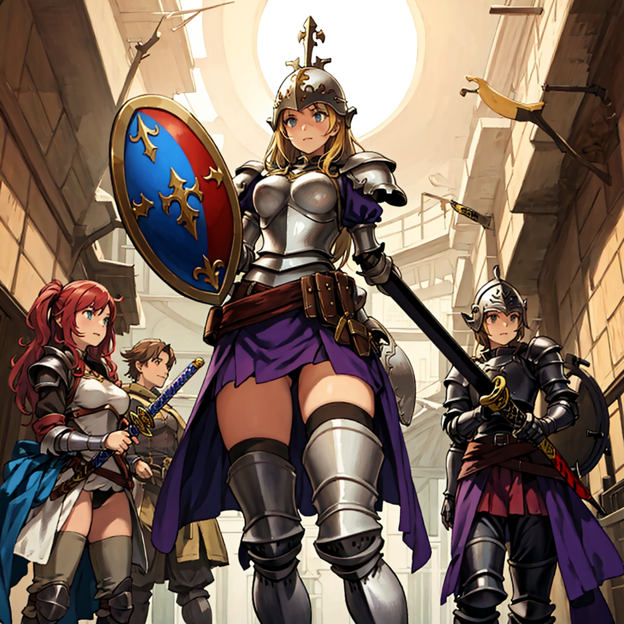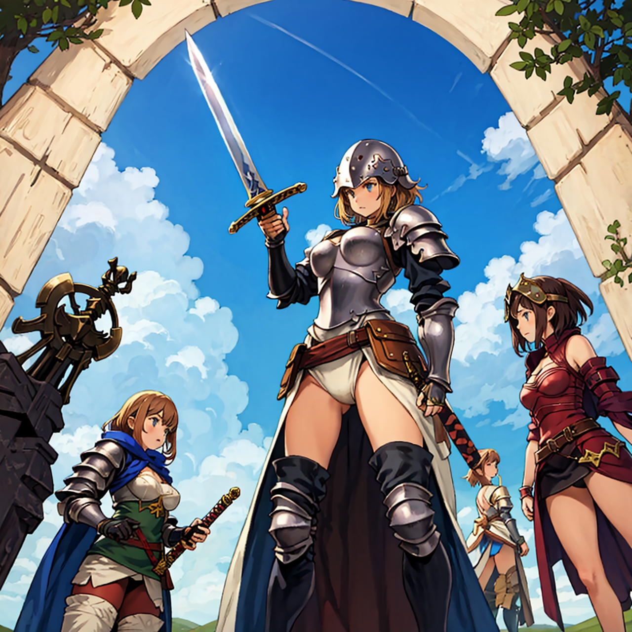 - shot from below party of standing girls d & d characters sword shield armor stuff helmet