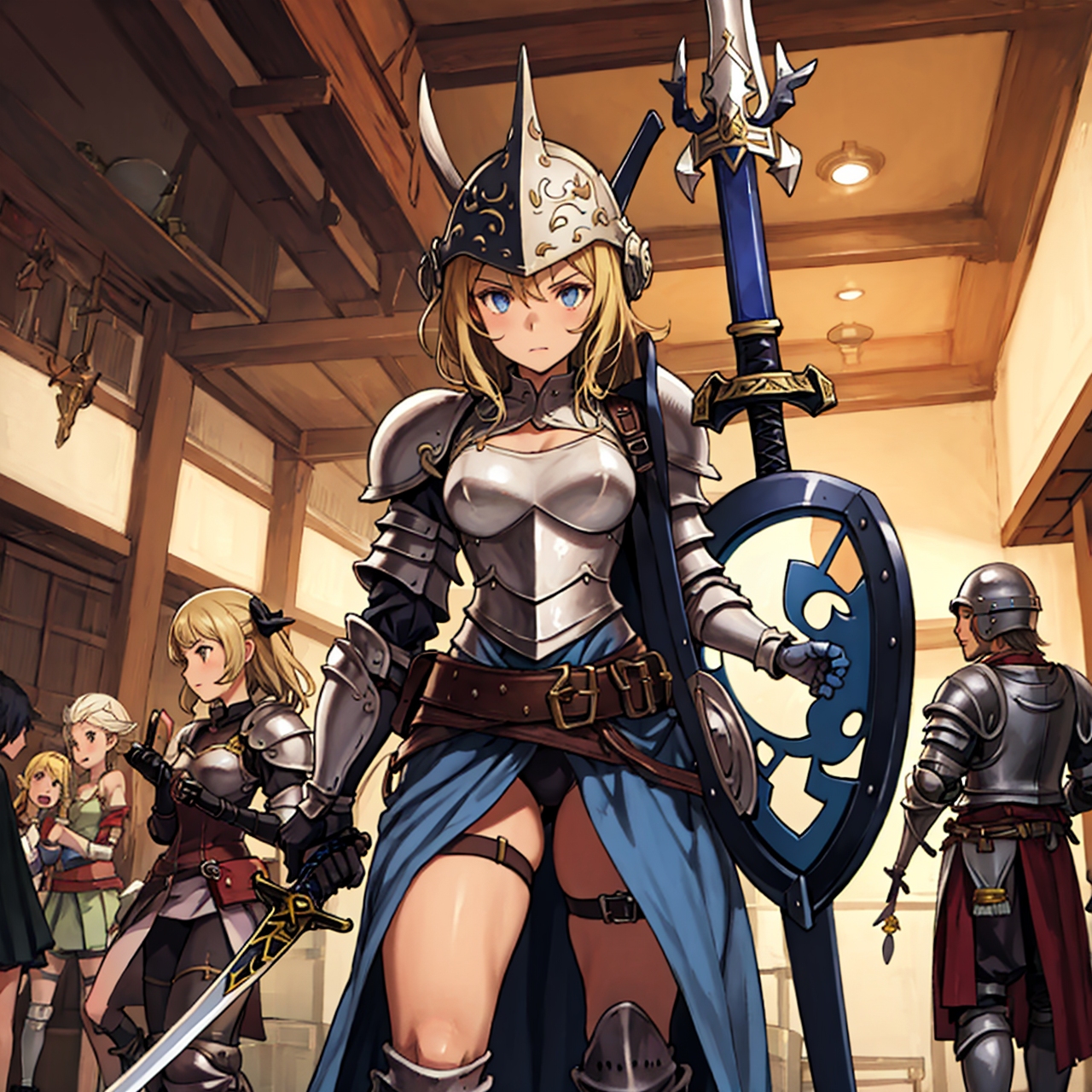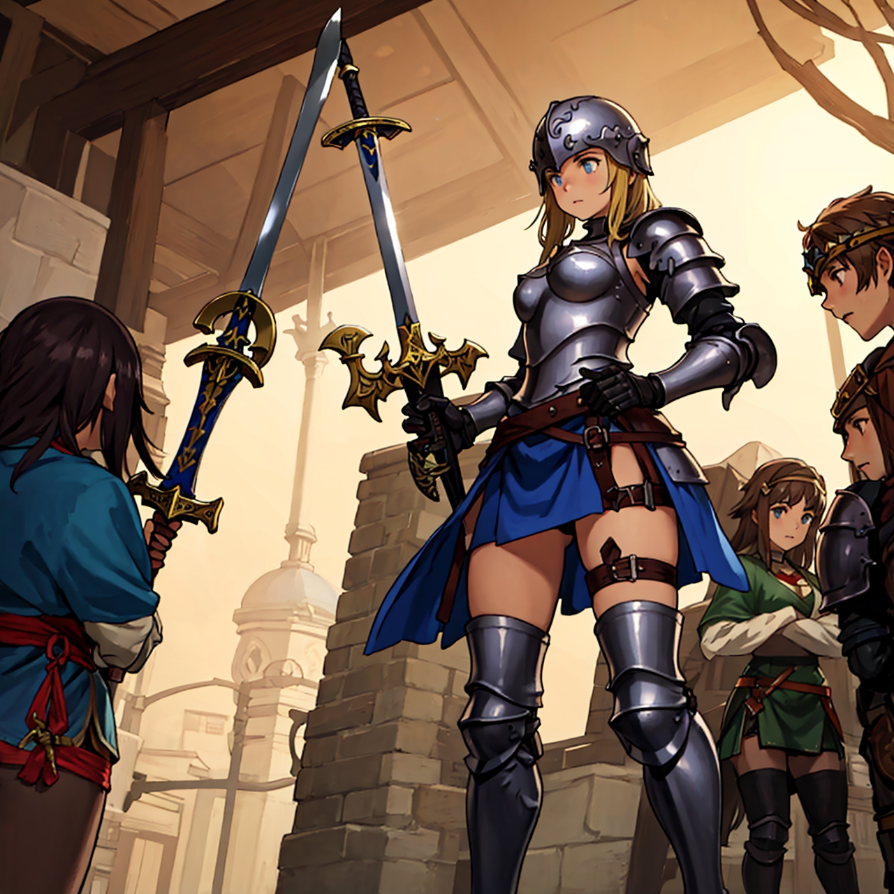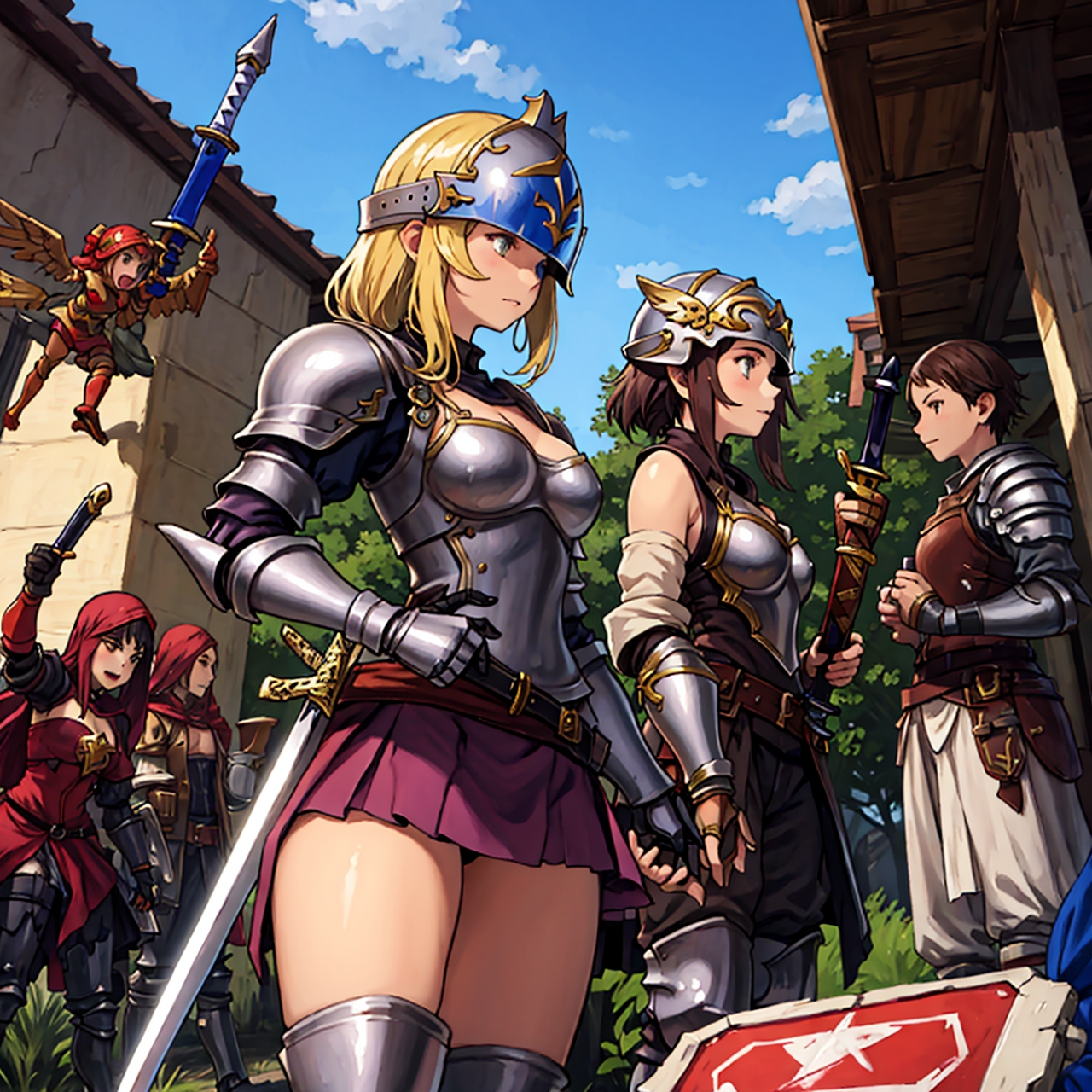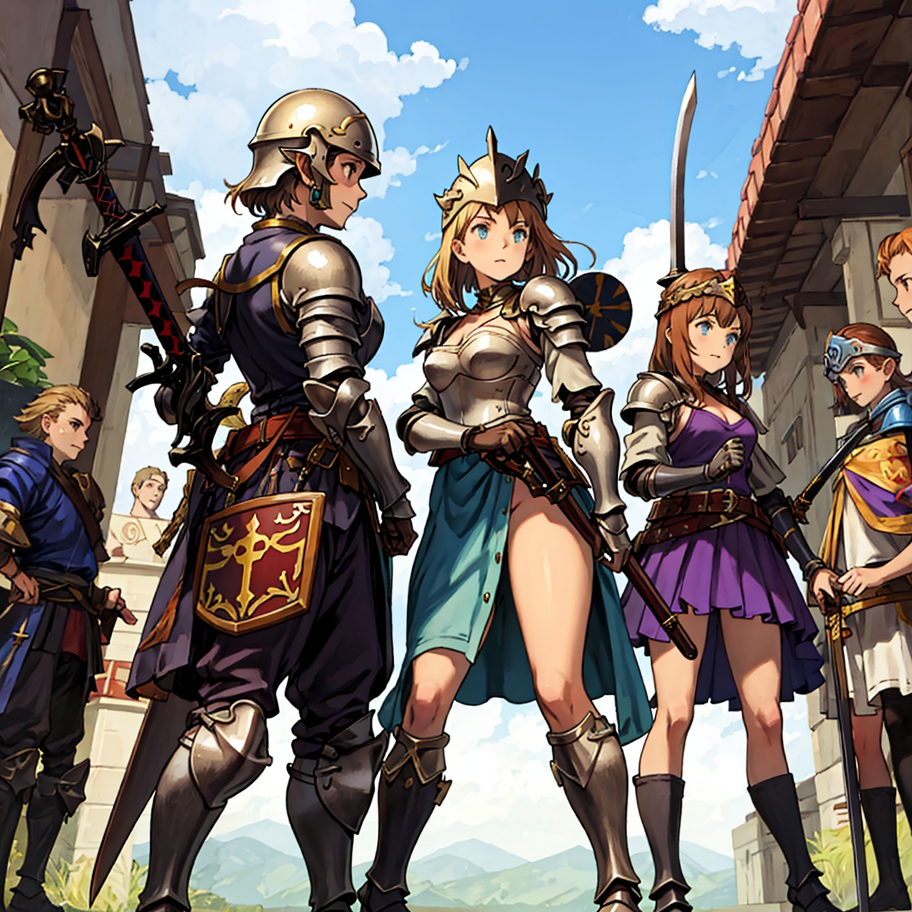 - shot from below party of standing girls d & d characters sword shield armor stuff helmet