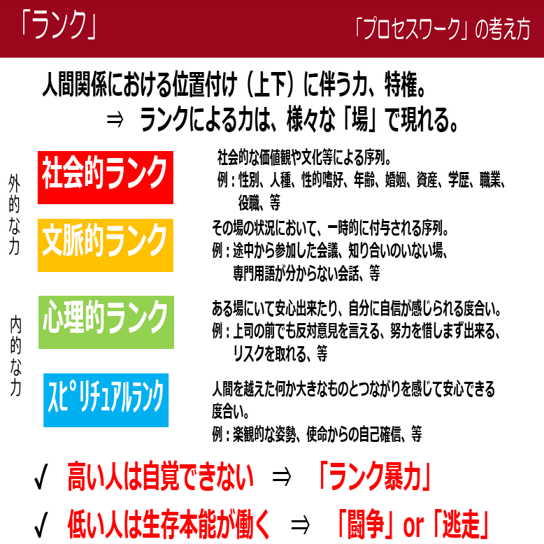 議員間討議が深まらない背景には、制度やルールだけでは説明できない「力の非対称性」があります。プロセスワークでは、こうした力や特権、優位性を「ランク」と呼びます。ランクは必ずしも悪いものではなく、自覚的に使えば場を支える力になります。しかし、無自覚に行使されると、対話の不均衡や排除を生む原因となります。