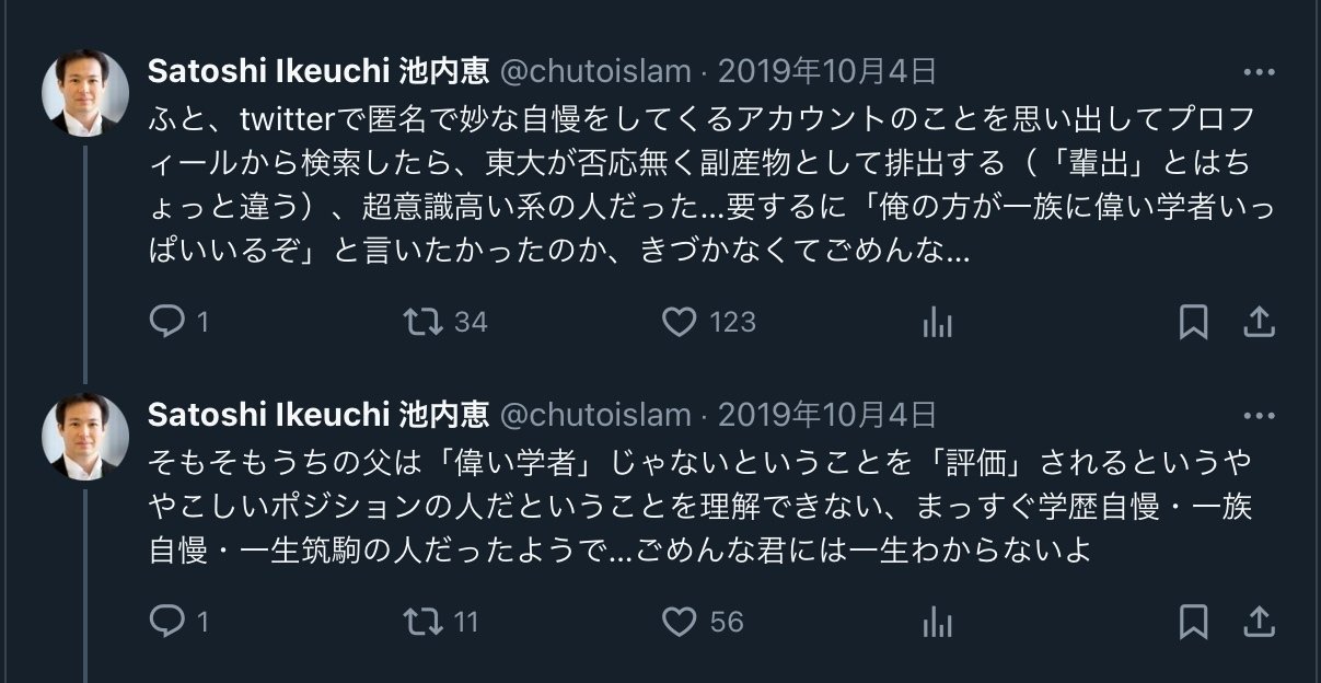 私は、2024年1月20日に、池内恵氏に対して「きちがいレベル」「低知能」「嘘つき」「泥棒」「バカ」「犯罪者」「馬鹿な犯罪者」といった根拠のない表現を用いた誹謗中傷をたび重ねてXに書き込みました。池内恵氏にお詫びして撤回いたします。