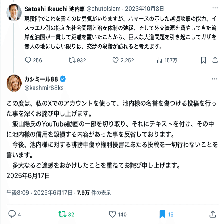 飯山陽氏のYouTube動画の一部を切り取り、それにテキストを付け、その中に池内様の信用を毀損する内容があった事を反省しております。…