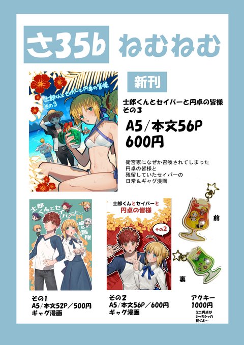 夏コミ!受かってた! 土曜日 西さ35b です! 初めてなので緊張しかないけど新刊出します! よろしくお願いします…! 円卓+士郎君ギャグ漫画本1,2,3、持ってきます!
