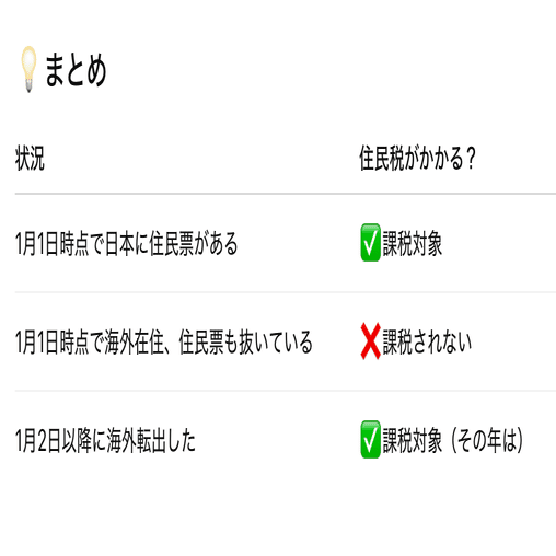 はい、基本的には「1月1日に日本に住所(住民票)がなければ、その年の住民税は課税されない」というのは事実です。ただし、いくつかのポイントや注意点がありますので、詳しくご説明します。
