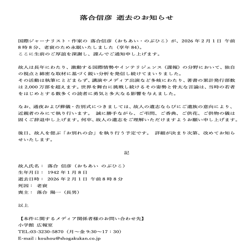 父で国際ジャーナリスト・作家の 落合信彦(おちあい・のぶひこ)が、2026年2月1日 午前8時8分、老衰のため永眠いたしました(享年84)。