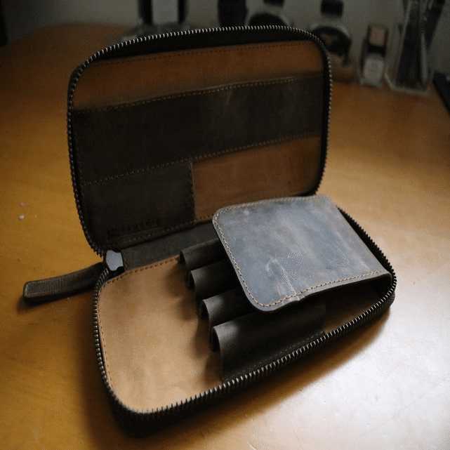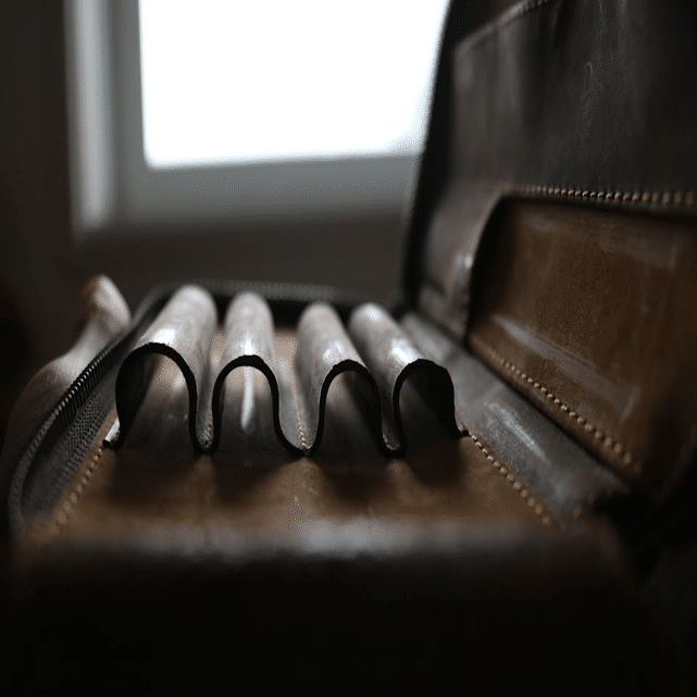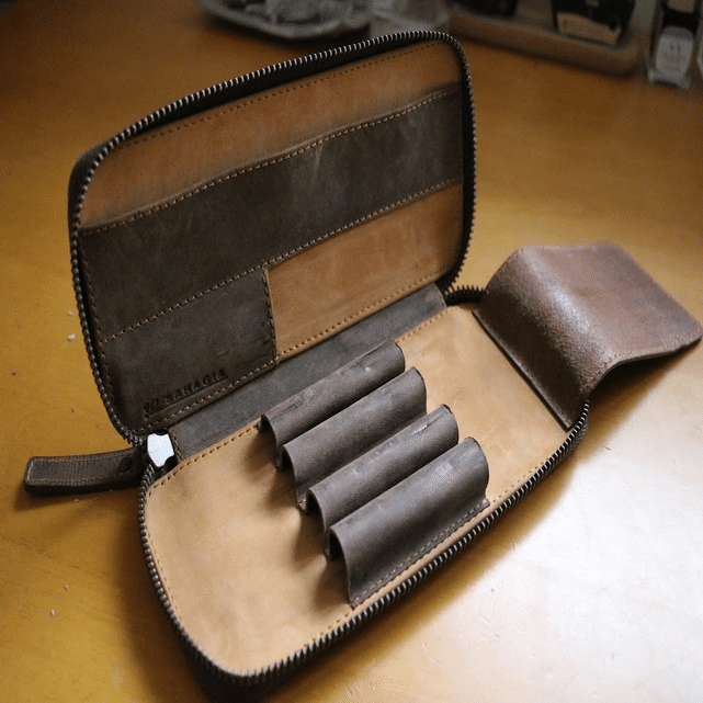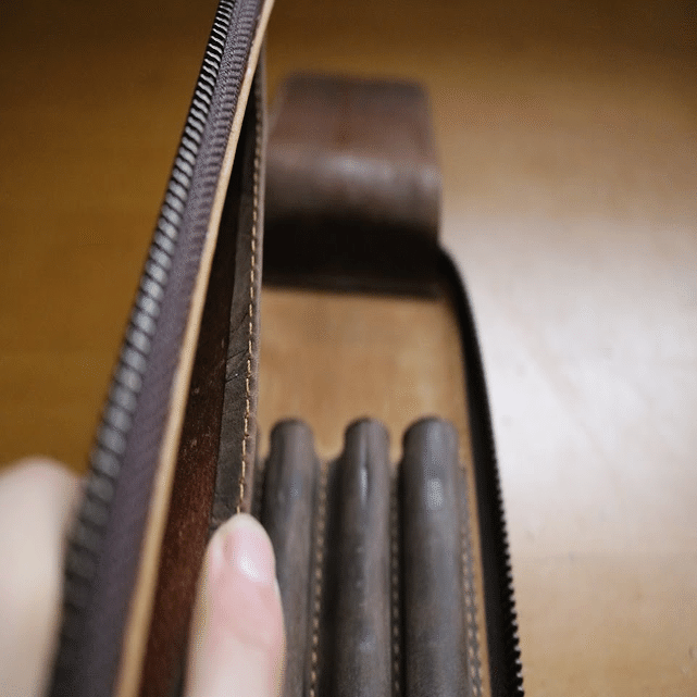 この筆箱にはクレイジーホースレザーのストロングという牛革が使われています。(馬の鞍に使われていたからホースレザーなんですって)