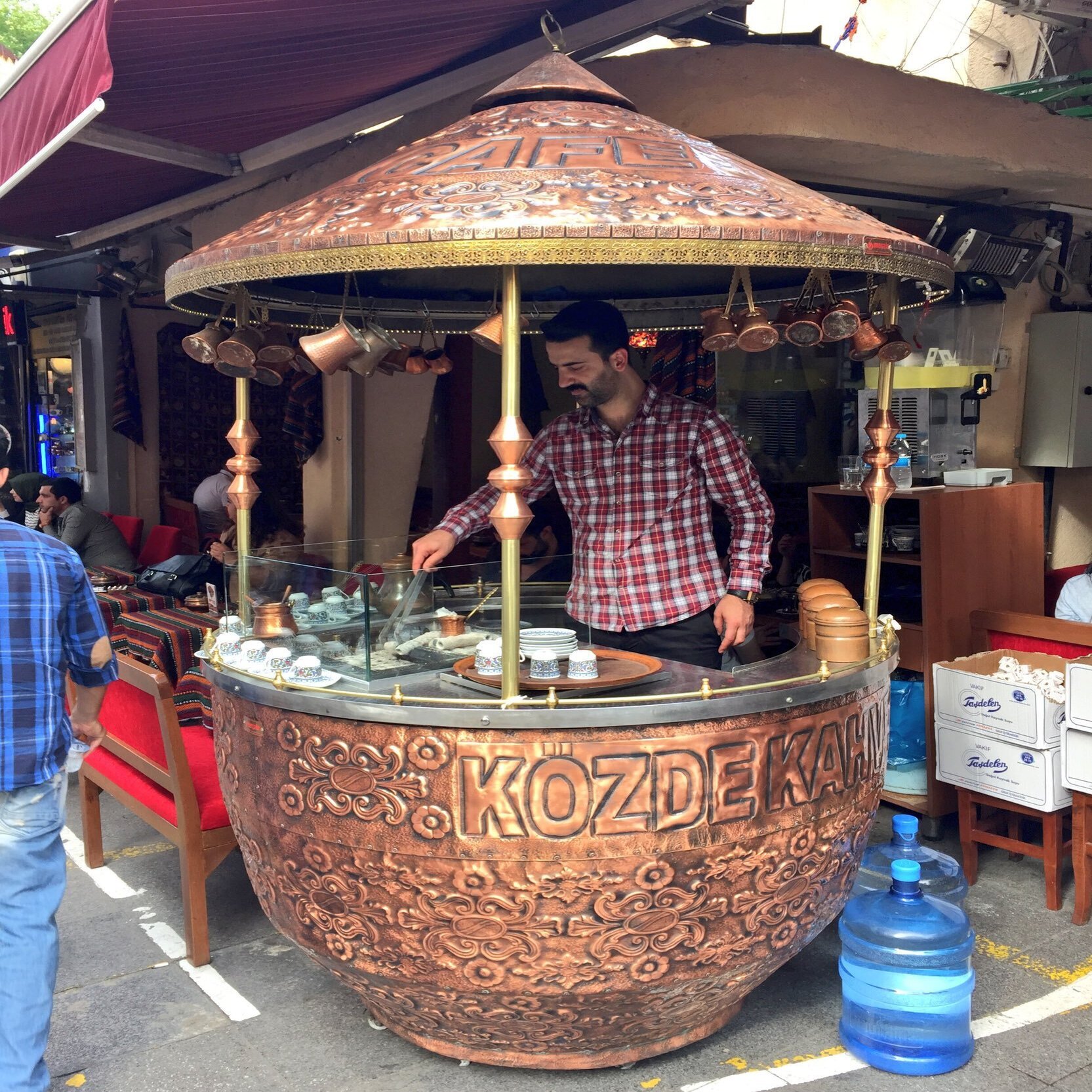 イスタンブールの街角では、いまも銅製の小鍋「ジェズベ」や「イブリーク」を火にかけたり熱い砂の上で熱したりして煮立てる屋台が出ている。
