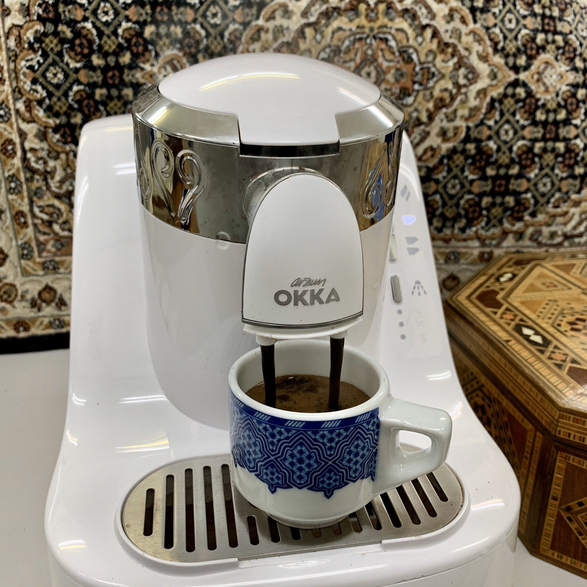 そんな伝統の国トルコにも、近年「トルココーヒーメーカー」が普及している。私が使っているのは「OKKA」というブランドのもの。水を注ぎ、粉を入れ、ボタンを押せば、数分で本格的なトルココーヒーが2杯同時にできあがる。