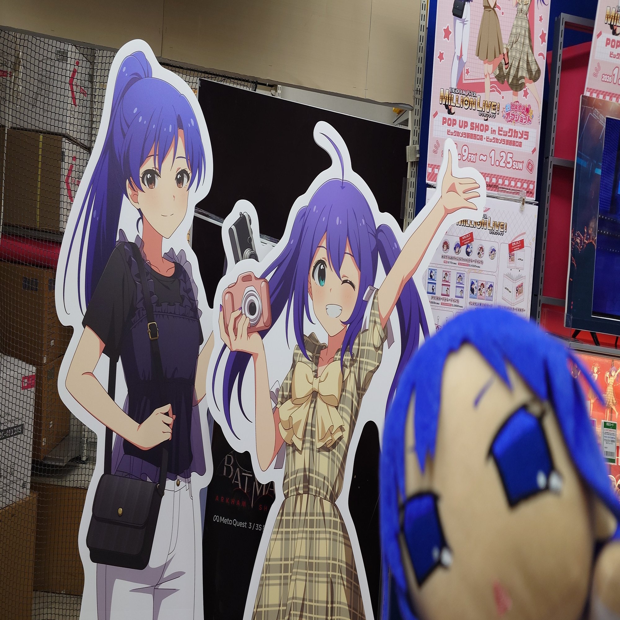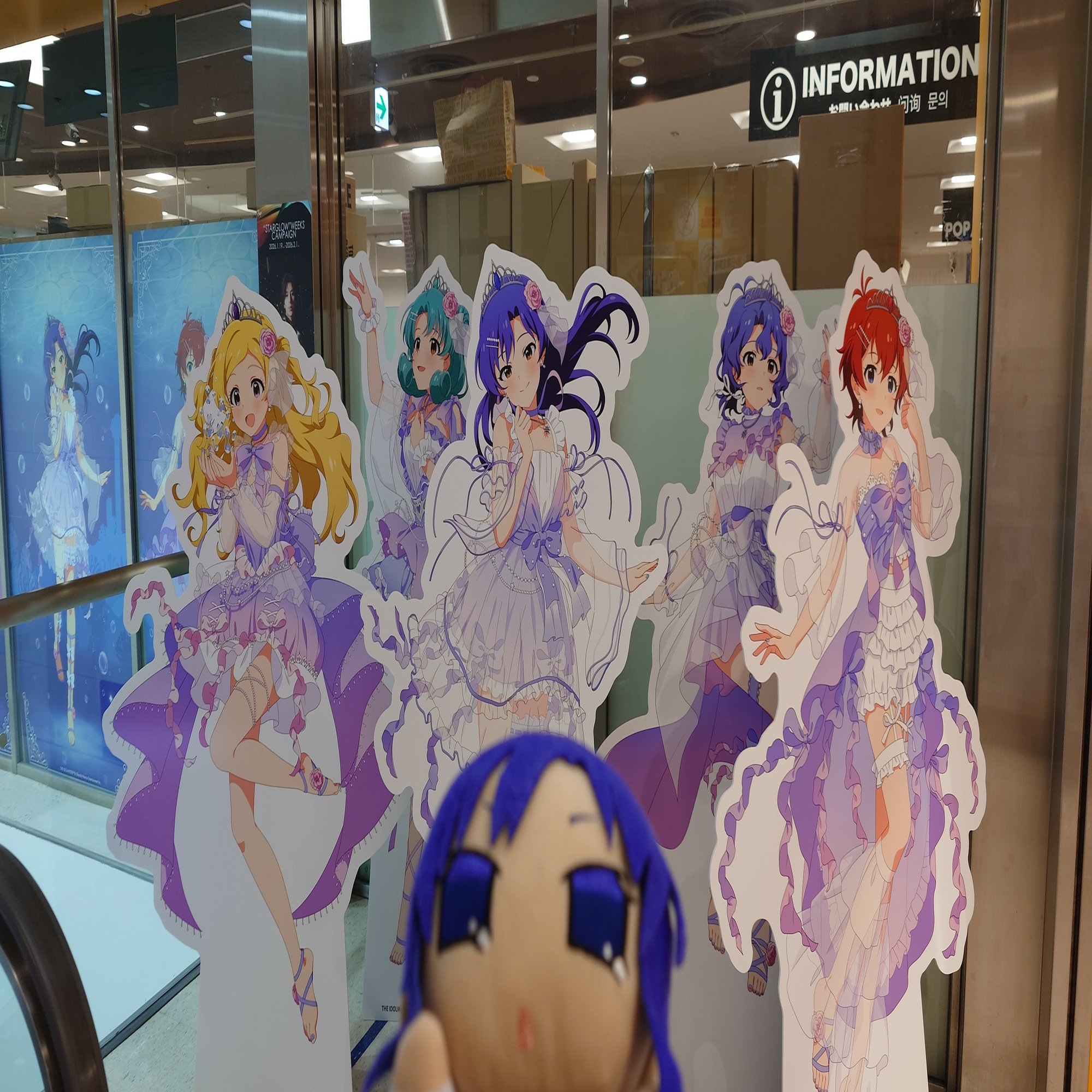 等身大パネル、グッズ展示のほか、ミリシタのMVを上映中でした。Just be myself!!などのソロ曲も流れていました。