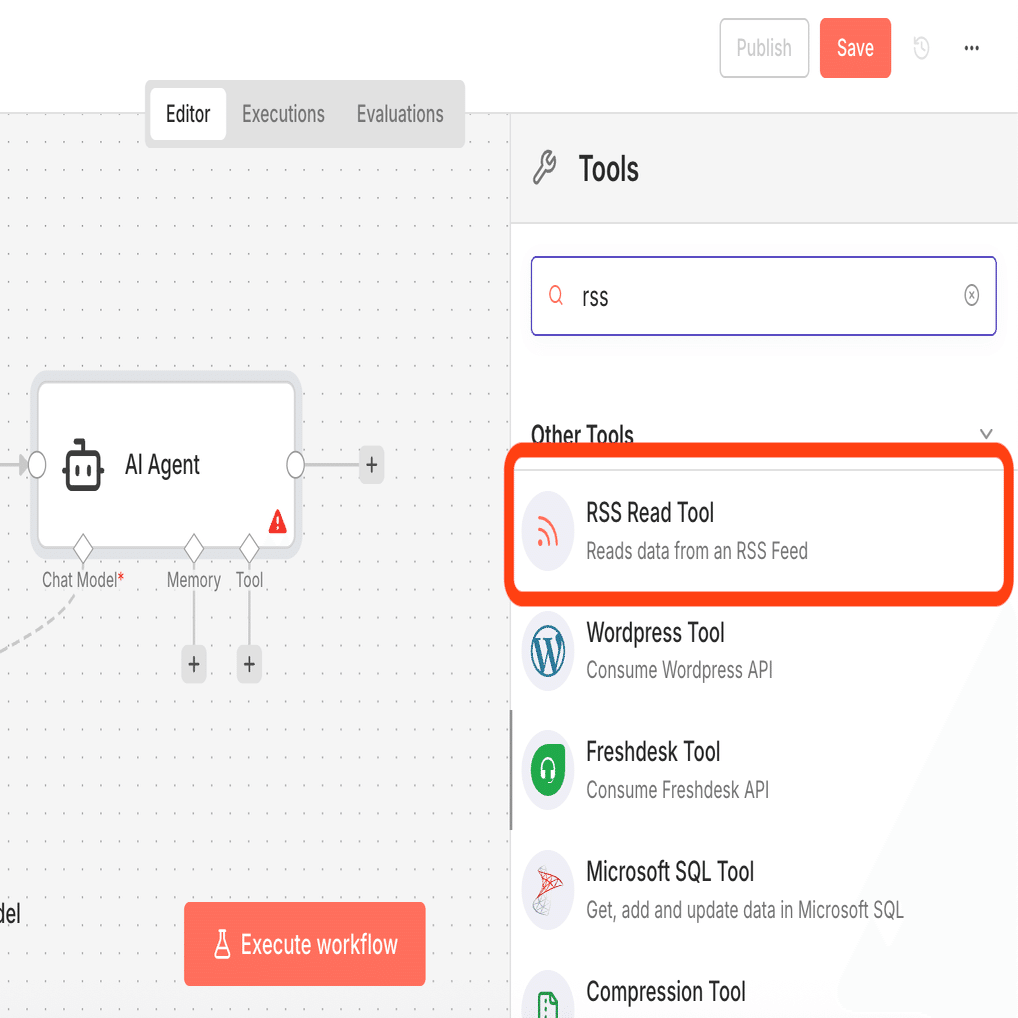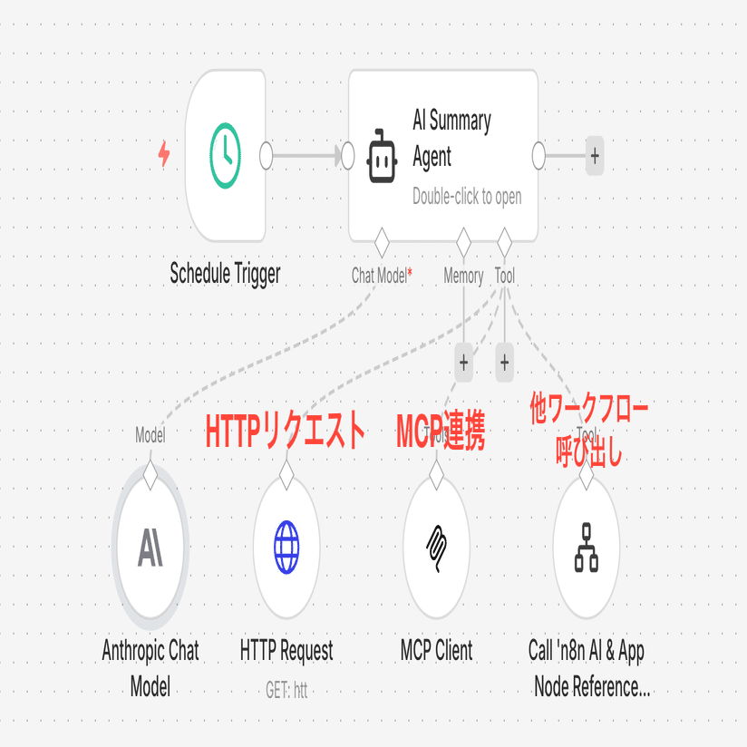 複数の道具をセットしておくと、AIエージェントが自律的に判断して、回答を導くために必要なツールを選択して実行するワークフローを構築することができます。