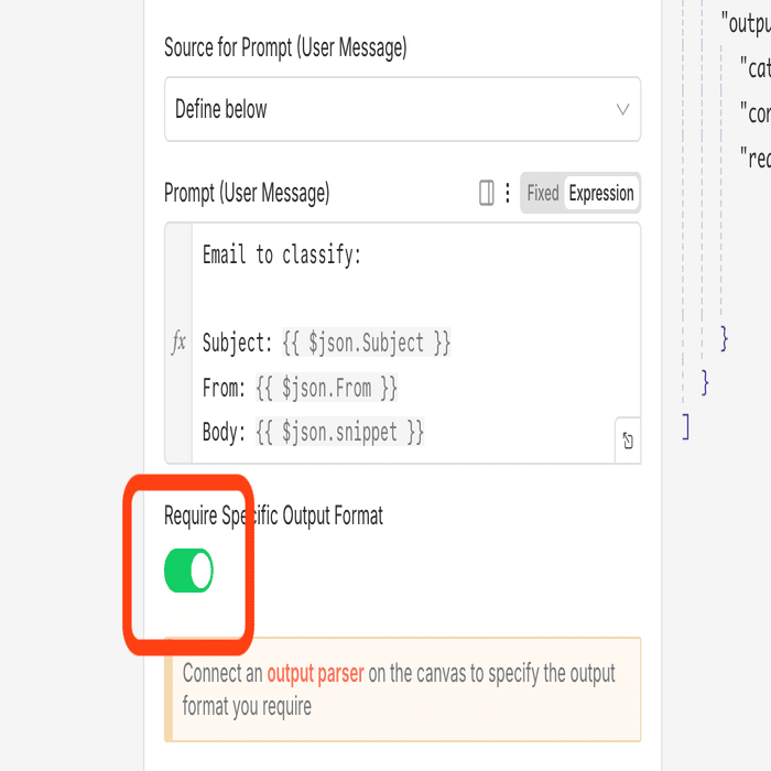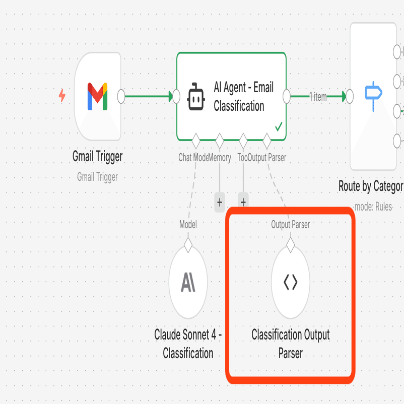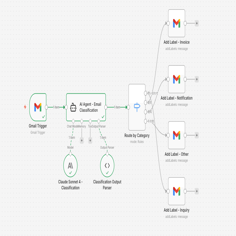 手前の「AI Agent」ノードでは、Gmailで受信したメールの内容を解析し、「請求、通知、その他、問い合わせ」のいずれか一つに分類します。