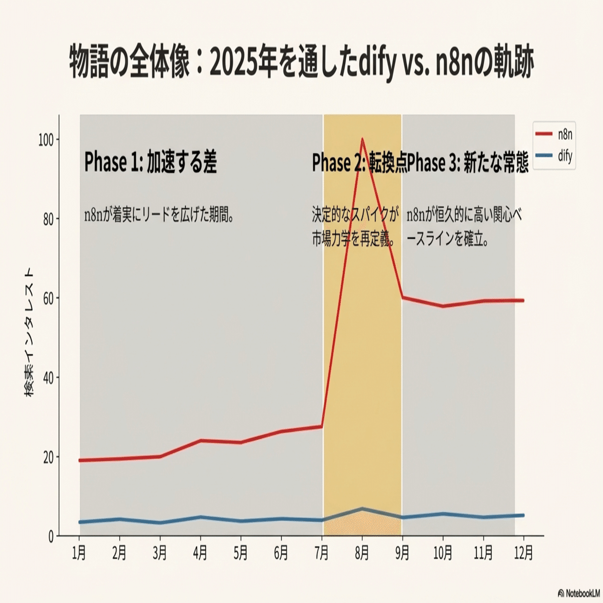 2025年上期までは、「Dify」と「n8n」では大きな開きがあり、Dify優勢の状態がずっと続いていました。