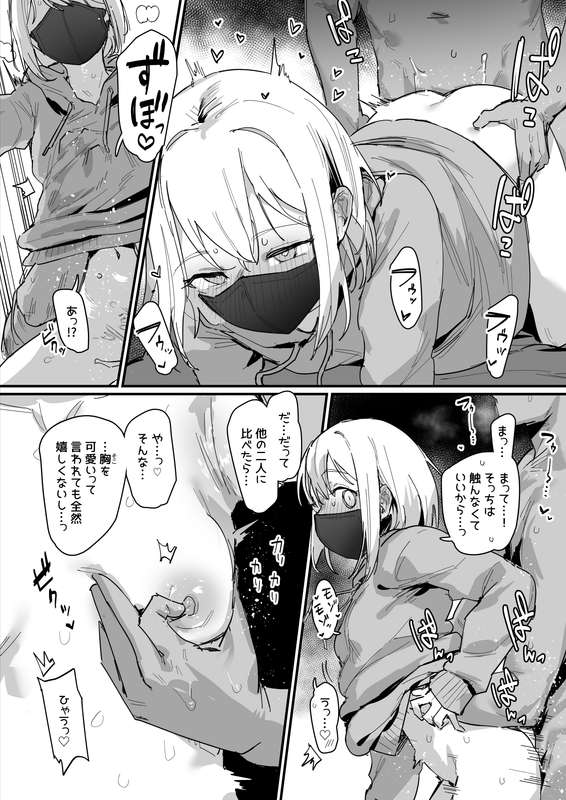 小さい分感度が良い このギャルです→ https://ie1.fanbox.cc/posts/8121078 | | | | | | ~~~~~~~Below is a transcript of the dialogue for translation~~~~~~~~ 1p …オタク君さ…その…今… …ぼ…勃起…してるよね…?なんで隠すの…? …私と二人きりでそうなってるってことは… その…そういうことでしょ…?しなくていいの…? …あっ…いや…これはあの…… わ…私は別に隠してたとかじゃなくて… ……うう… 2p あっ!? まっ…まって…!そっちは触らなくていいから…!うっ…♡ だ…だって他の二人に比べたら… やっ…そんな……胸を可愛いって言われても嬉しくないし…っひゃう♡ 3p あ♡や♡だめ…っ♡恥ずかし…っ あ♡あ~~~♡ [就寝前に思い出しオナニー] (自分で触るよりずっと気持ちよかった…) 実は一人でするときは毎回いじっている→ うー…イク…♡