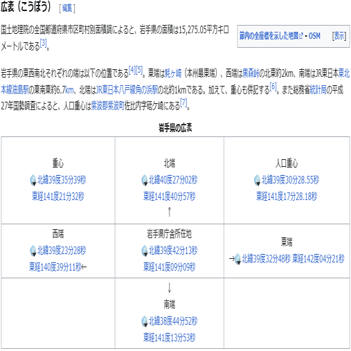 岩手県の記事を例にとりましょう。この広袤という節には、四至(東端・西端・南端・北端)、そして県庁と人口重心と、図形としてみた時の重心、以上7つの座標が纏まっています。