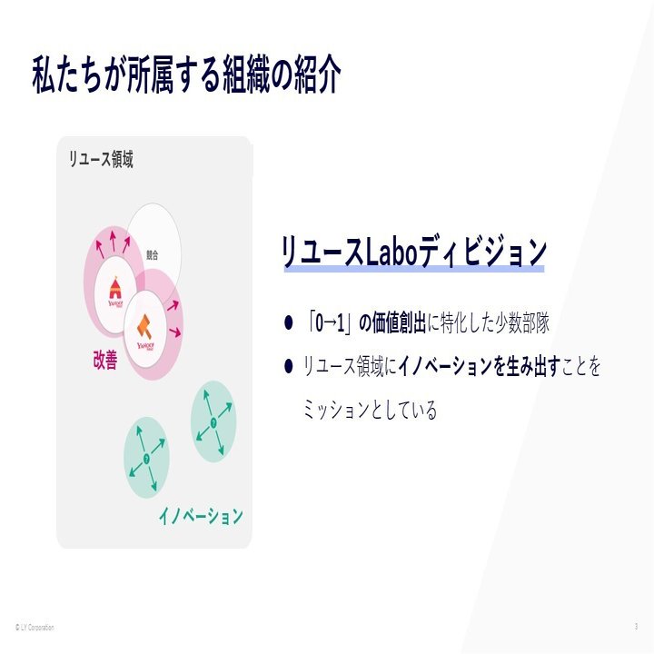 私たちが所属する「リユースLaboディビジョン」は、Yahoo!オークション、Yahoo!フリマなどのリユース領域のサービスを運営する組織の中で、既存サービスの改善ではなく「0→1の価値創出」に特化した少数部隊です。