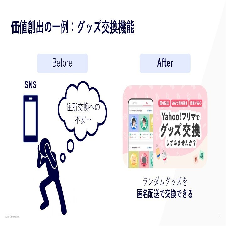 これらの課題に対して、匿名配送でできるだけ安全に交換できる仕組みを提供したのがYahoo!フリマのグッズ交換です。その結果、「売る・買う」しかなかったフリマに「交換する」という新しい価値が生まれました。