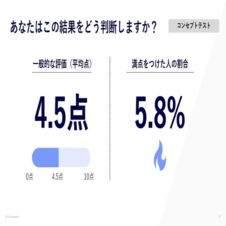 これは、あるコンセプトテストの例です。平均点は4.5点(10点満点)でしたが、満点(10点)をつけた人が5.8%いました。
