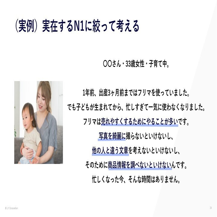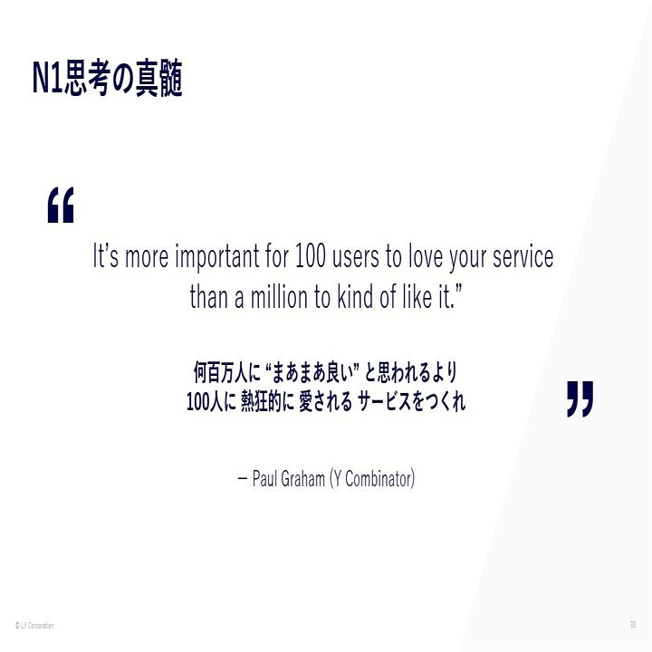 次に必要なのは、その芽をどのように育てるか。ここで活きるのが 「N1思考」――特定の一人の深い課題に向き合うことで、プロダクトの解像度を高めていきます。
