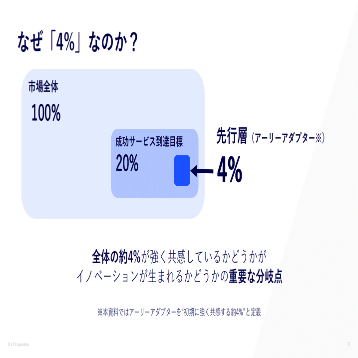 多くのヒットサービスでも、市場の約20%に届けば成功と考えられており、さらにイノベーター理論によると、特に熱量が高い先行層はその約20%、つまり市場全体の約4%だと私たちは考えます。