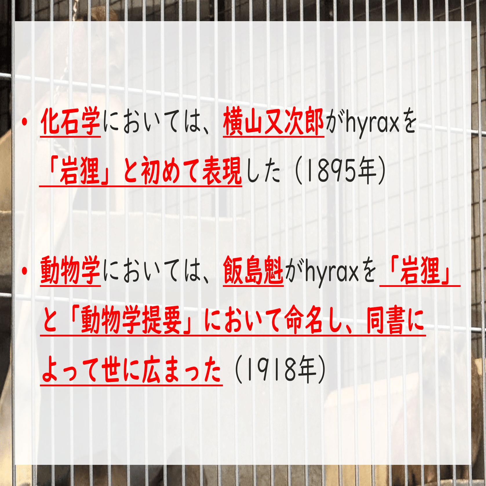 飯島博士って人がHyraxを岩狸って命名したんだって。