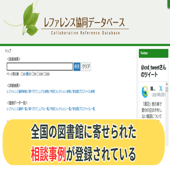 レファレンス協同データベースは、全国の図書館に寄せられた相談の事例が登録されているウェブサイトなんだよね。