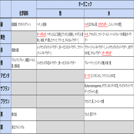 なんと、色別の原材料が明らかになりました……!なるほど、近年は化学染料で代用されるケースが多いみたいだね。ただそれが原因となって皮膚炎を引き起こすこともあるそう……。