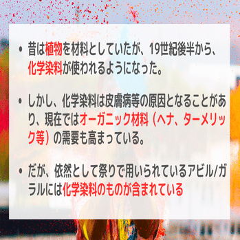 (「ホーリー」の色は、かつては春に咲く花から作られていた。長い年月を経て、都市化と工業化が進むにつれて、こうした自然の色は合成染料や工業用染料で代用されるようになった。一般的に使用される色は、黒(酸化鉛)、緑(硫酸銅、マラカイトグリーン)、銀(臭化アルミニウム)、青(プルシアンブルー、硝酸コバルト、藍、亜鉛塩)、赤(硫酸水銀)である。)※日本語訳はDeepLを使用