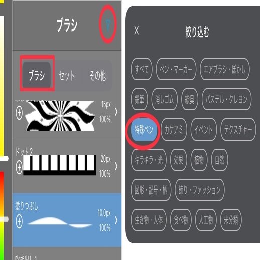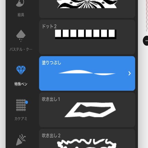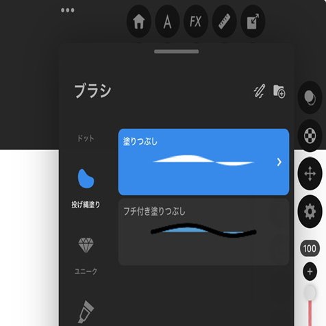 メディバン系はブラシとして投げ縄塗りがありますが、ブラシの名前自体はシンプルに「塗りつぶし」です。
