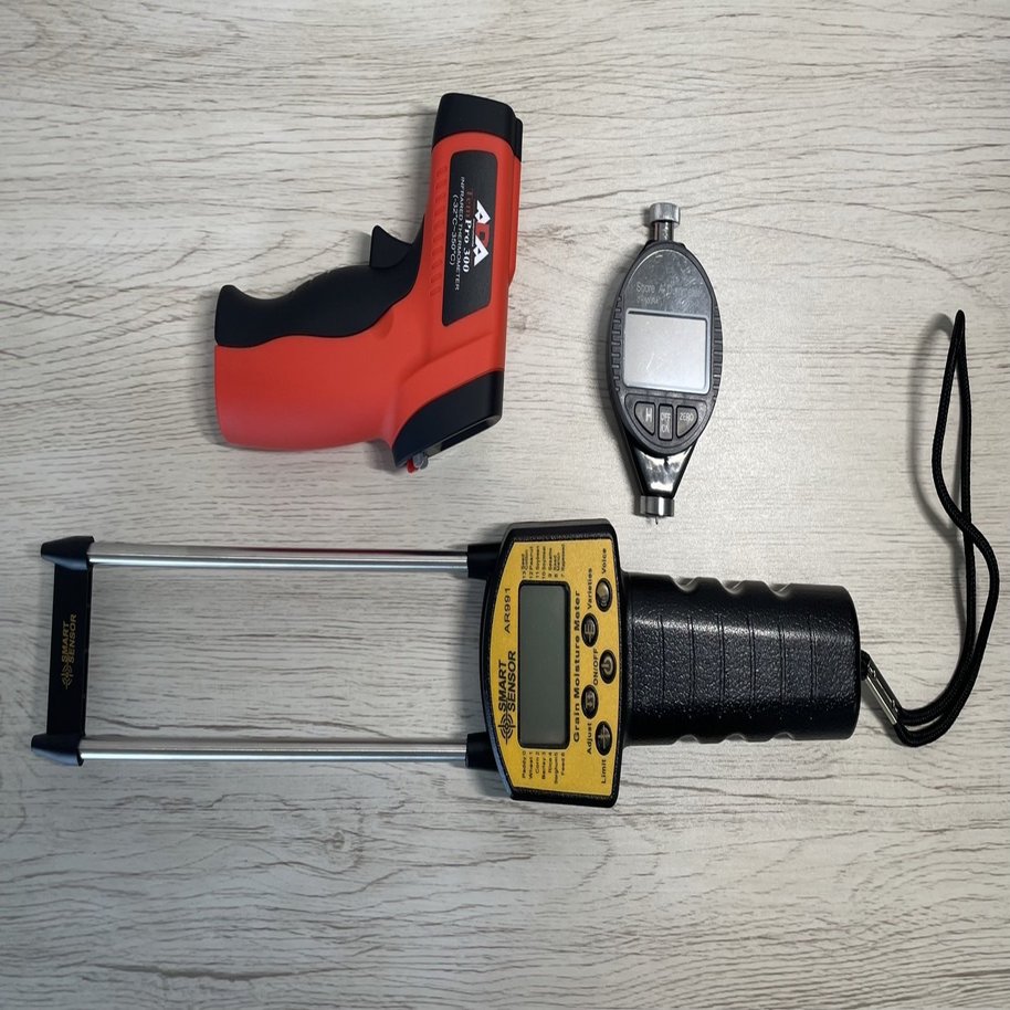赤い銃のような機械が「赤外線温度計」。非接触式の温度計で、フライパンなどの熱さを見るのに使われるものを用意した。