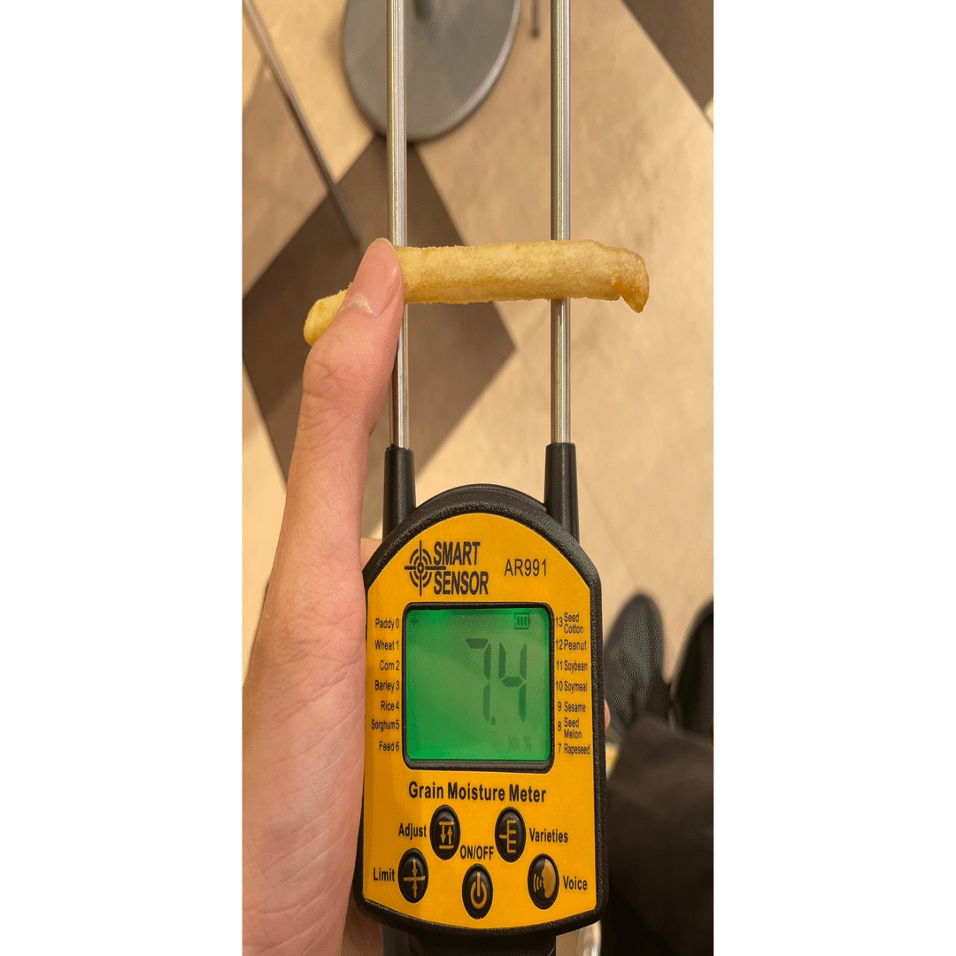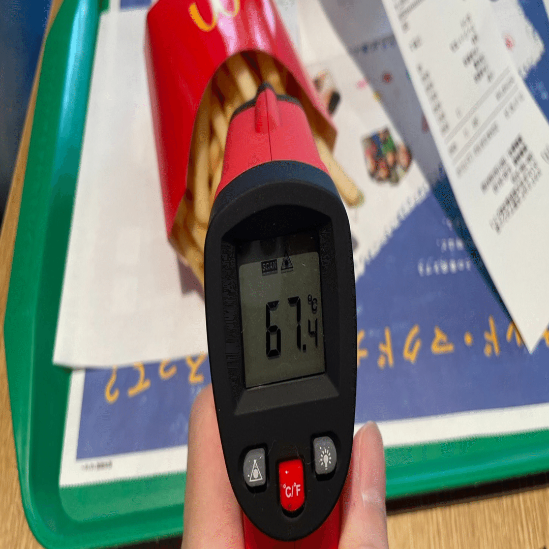ポテトの温度を正確に測る場合、紙袋からパックを取り出さないといけないが、その際にポテトは外気に触れて熱を失い、水分を得てしまう。