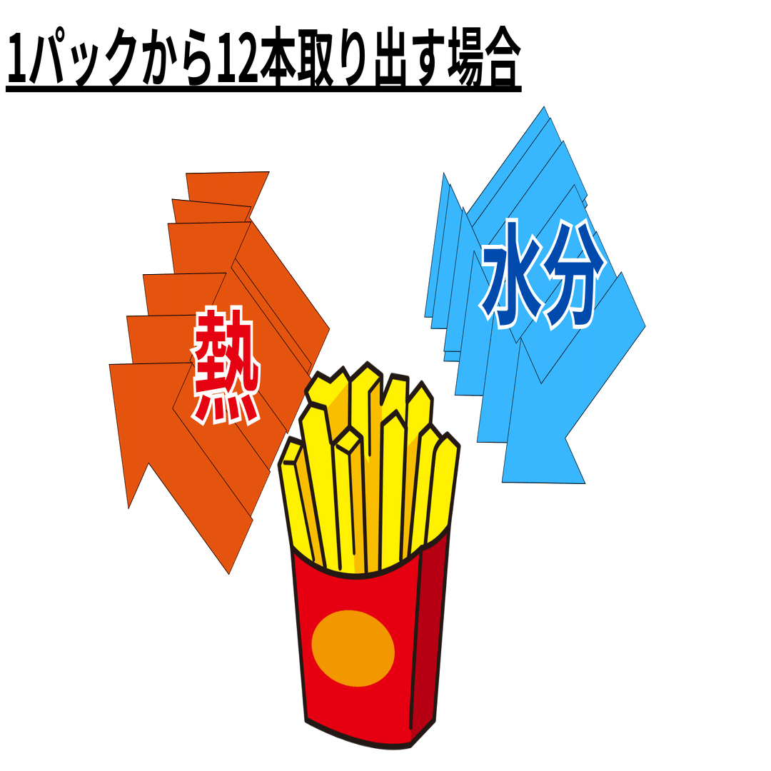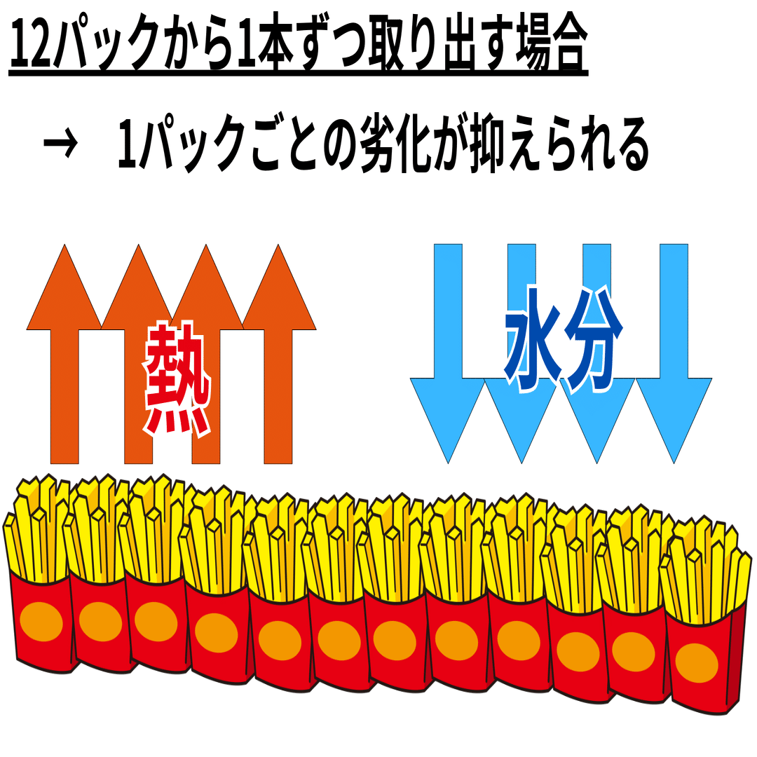 1パックから12本のポテトを取り出すとき、ポテトを12回も外気にさらすことになり、通常時のポテトの条件を反映しているとはいいがたい。