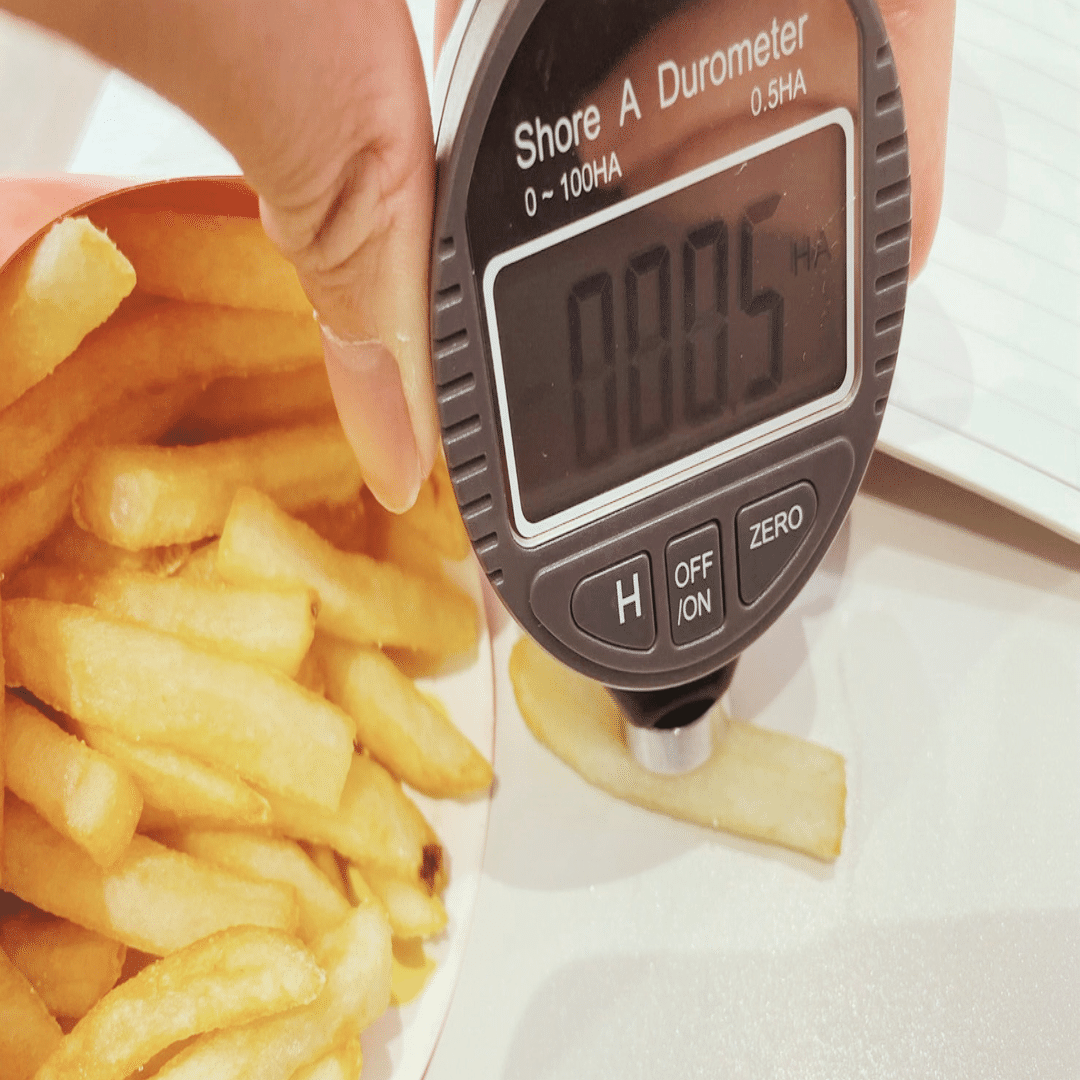 太ももやゴムなど、「やわらかいけどしっかりしている」ものなら計測可能だが、ポテトなどの「もろいもの」では先にモノの方が崩れてしまい正しい硬度が図れないのだ。