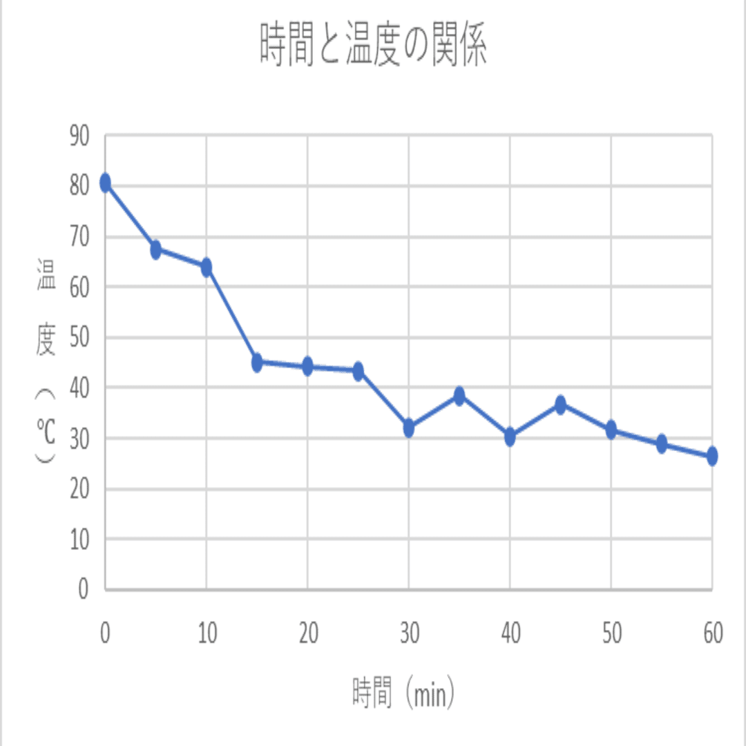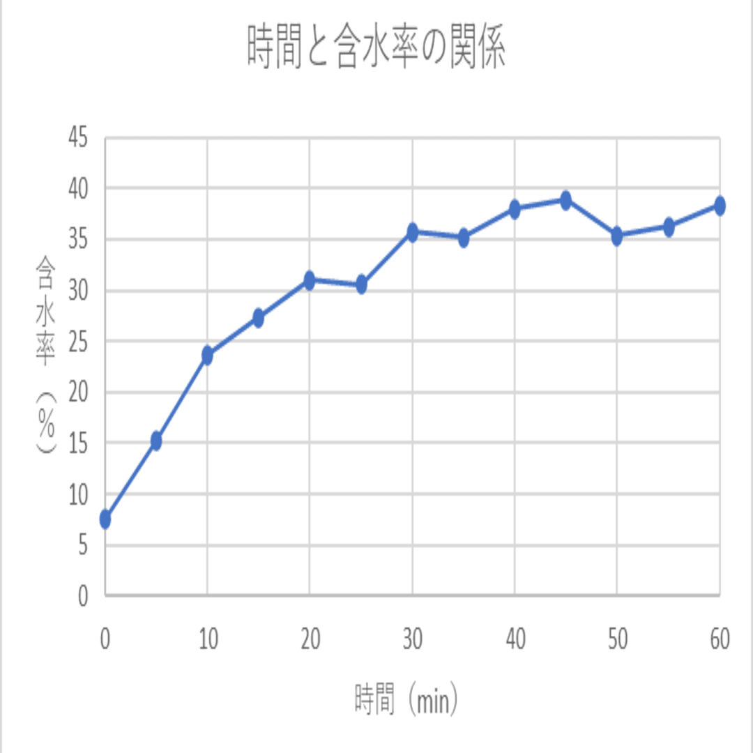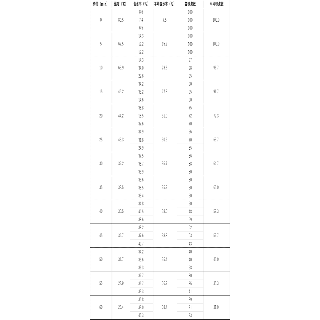 まず、10分から20分にかけて温度の急激な低下と含水率の大きな上昇が見られ、それに伴い味の点数も一気に下がっているのがわかる。