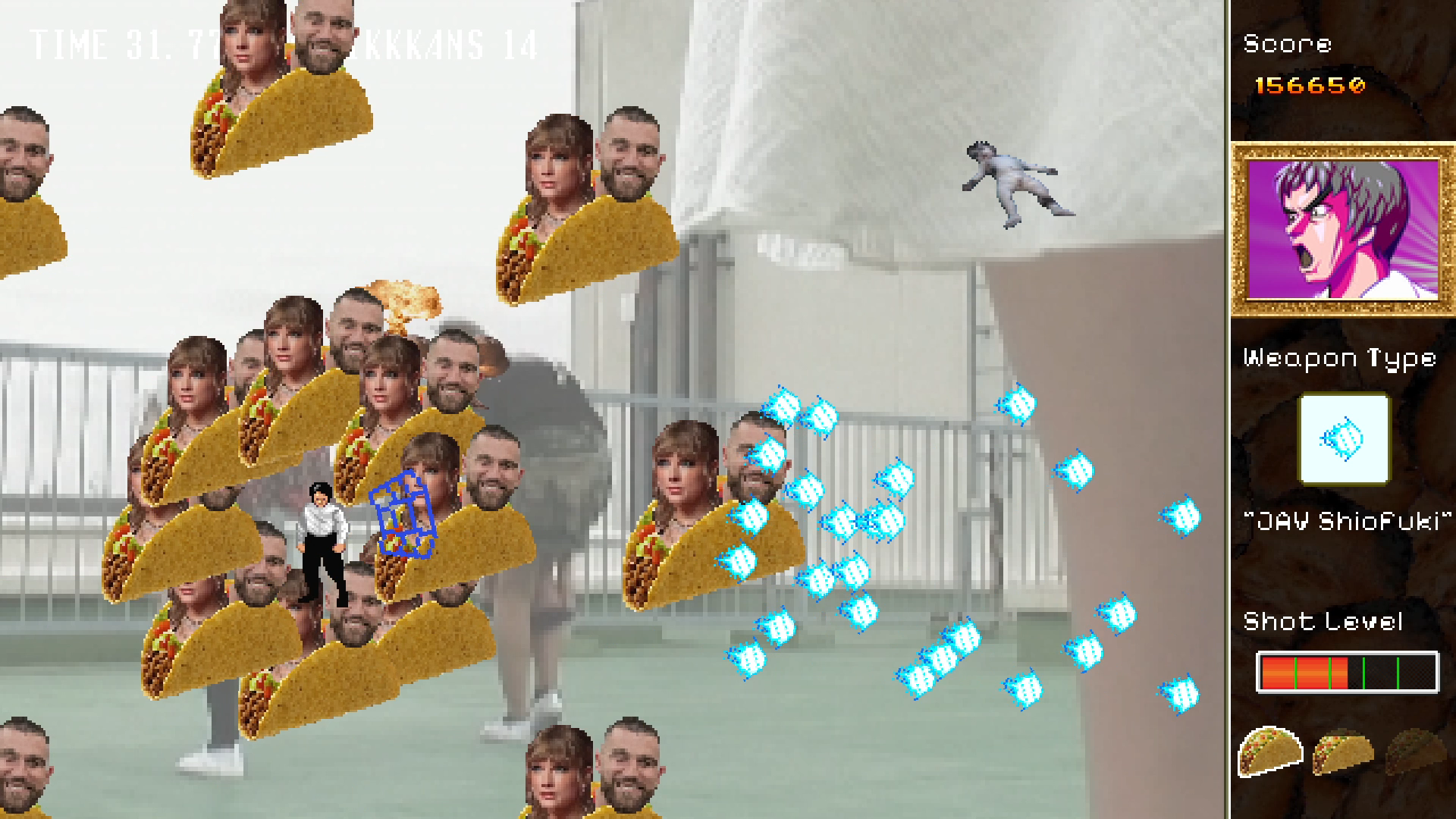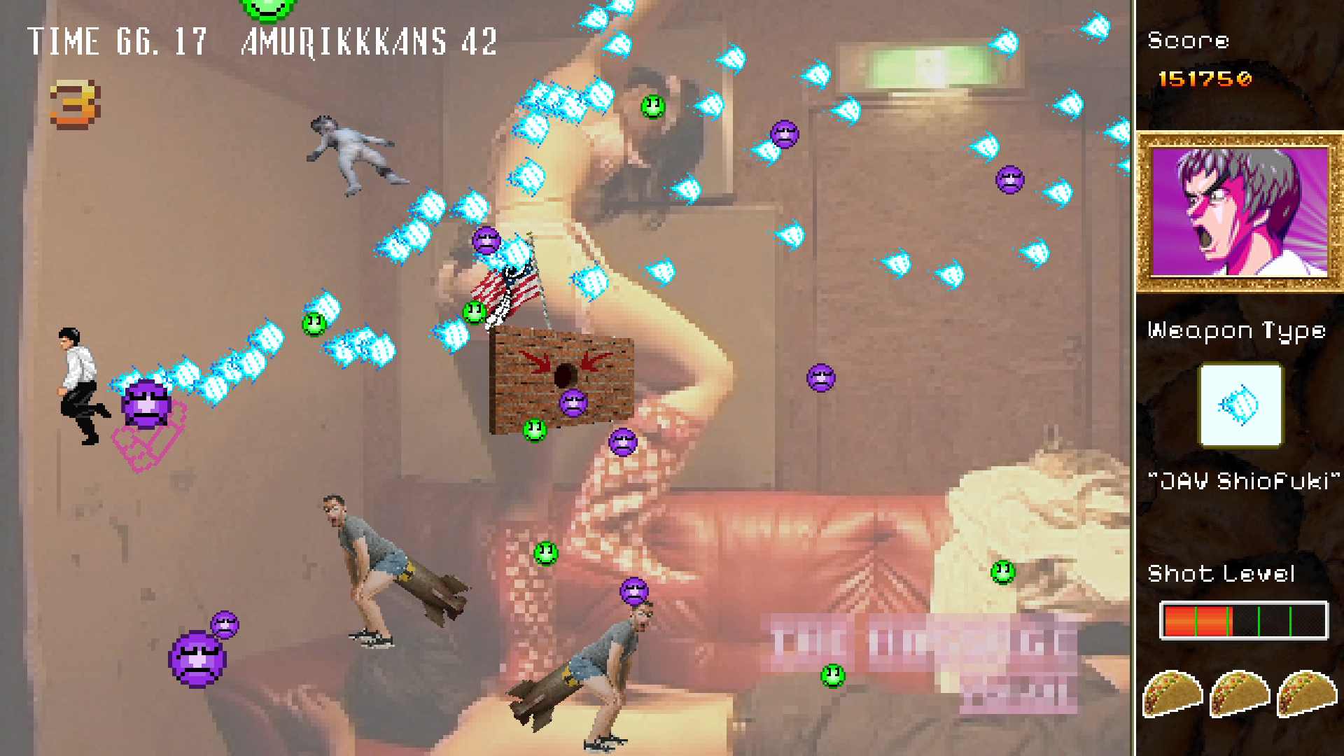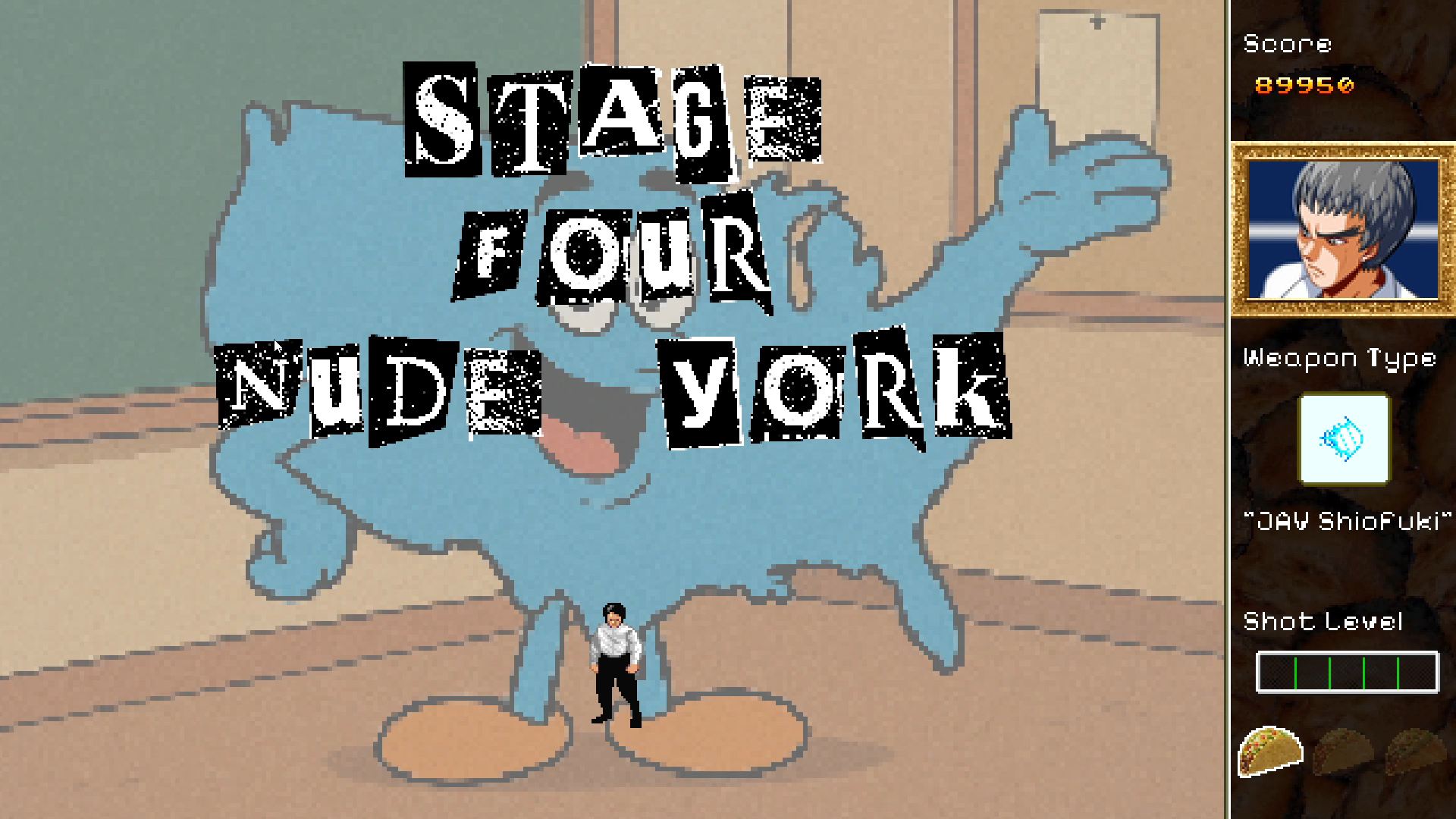 While Hong Kong 2097 is a much more fleshed out game than the original, you can still expect the tasteless story, haphazard character design, head-scratchingly random environments and 7 second music loops that made Hong Kong 97 so "great". One minute you'll be shooting down dancing hot dogs on a ranch in Texass, and the next you'll be fighting off flasher Uncle Sams in Idahoe.