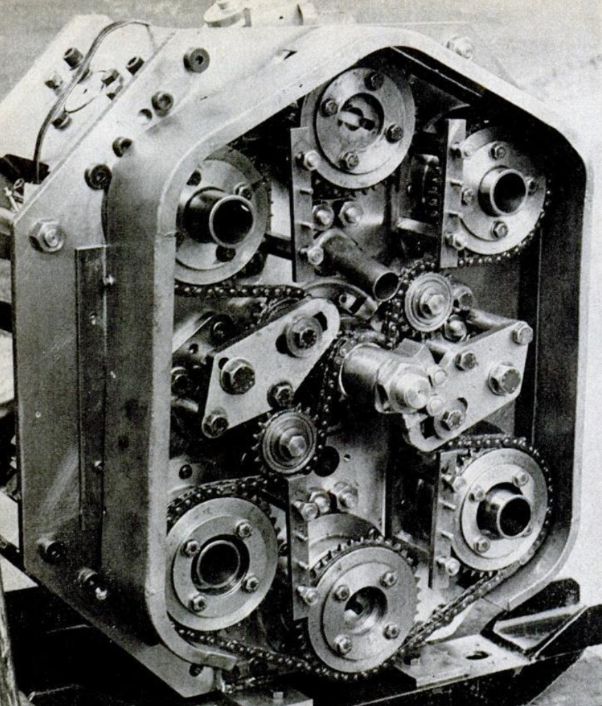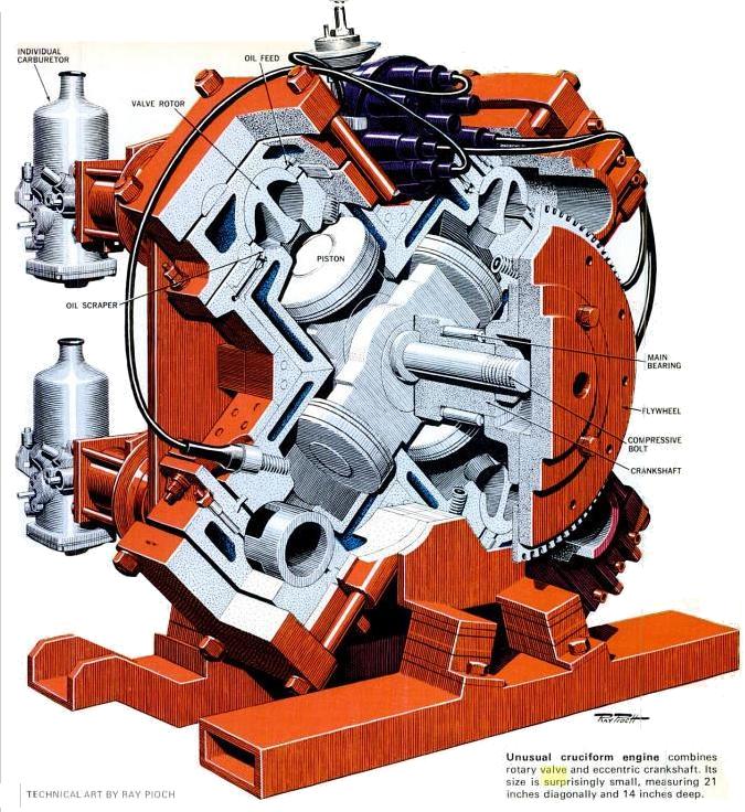 The most immediate visual feature of the Esso-Cross engine is its cylinder configuration. While it could be classified as an X engine, it is far from standard, and the name “Cross” has nothing to do with the design itself. Each pair of aligned cylinders featured a pair of pistons connected not with traditional connecting rods, but rather a single bar that not only locks the pistons into a perpetual thrust and parry with each other, but also engages the crankshaft eccentric, providing rotational motivation.