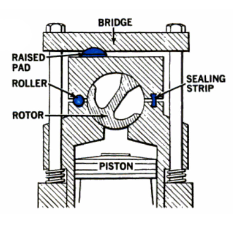 The major unique feature of the Esso-Cross engine was the use of rotary vane valves. A cylinder with specific size and shaped voids would rotate like an overhead cam, but the voids in the cylinder acted like both a cam lobe and poppet valve, in that it both allowed intake air and fuel into the cylinder, sealed against combustion, and then a separate void in the cylinder allowed spent gasses to be expelled as it rotated by the cylinder opening.